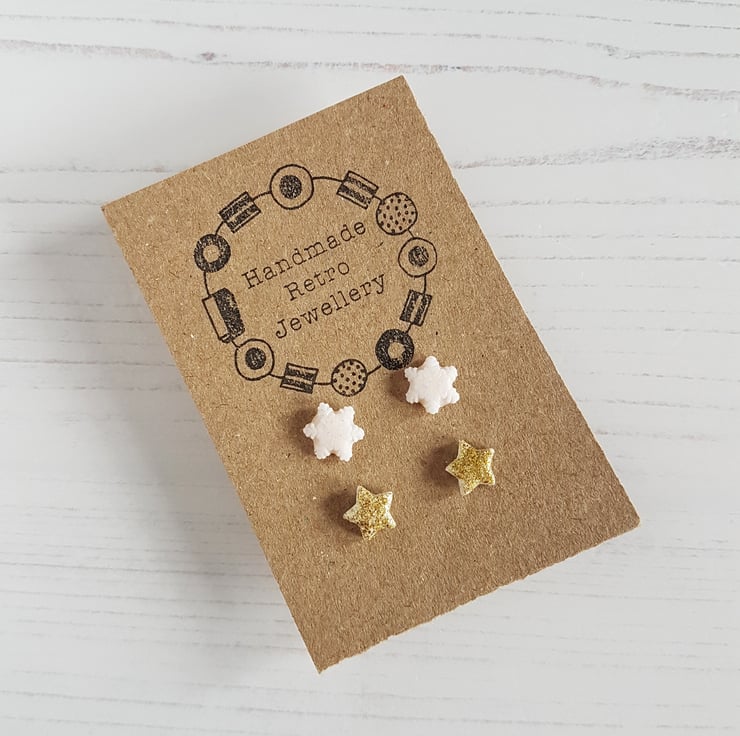These micro size snowflake and Star earrings have been carefully hand crafted using polymer clay - snowflakes in white glitter clay, stars in white clay with a layer of sparkly gold glitter. Cut into shape and then the edges have then been sanded for a smooth finish. The stars have also been sealed with a gloss to protect.