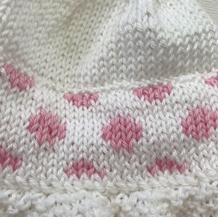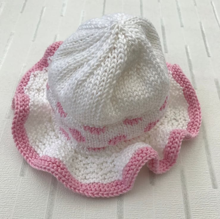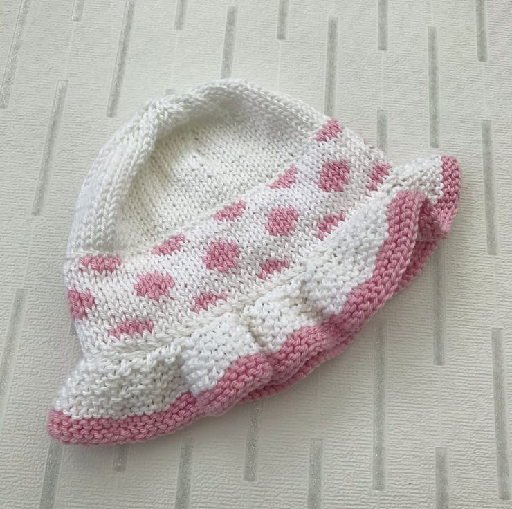 The hat is knitted in white and has a frilled brim edged in pink. A band of white with pink spots goes round the hat above the brim.