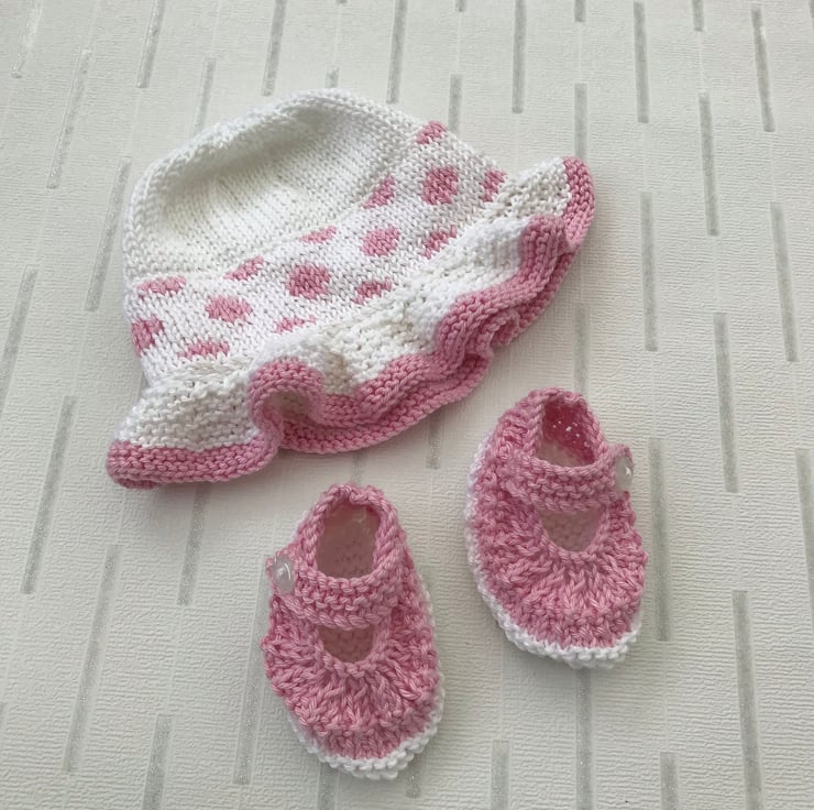 A pretty white and pink sunhat and shoes hand knitted in a cotton yarn.