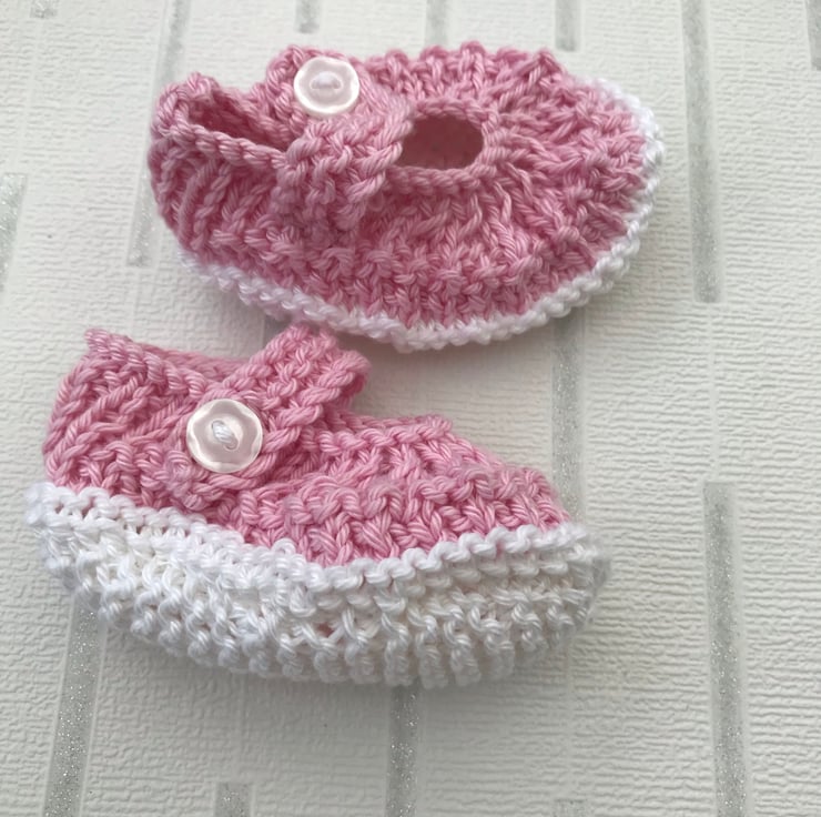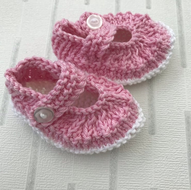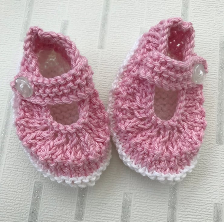 The pattern size is for birth to 3 month old with a hat circumference of 34cm. The shoes measure 8cm along the sole.