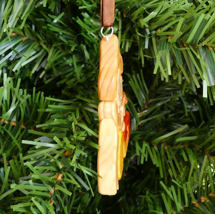 A piece of recycled wood was cleaned and sanded to enable me to upcycle it. The design was applied to the wood and cut using a Scroll Saw. The Intarsia woodworking technique was applied where different species of wood were cut and shaped into three dimensional pieces and then glued together to form a design. Some of the pieces were wood stained before being lacquered, which protects the ornament. To finish the decoration a loop and ribbon were added to allow for hanging.