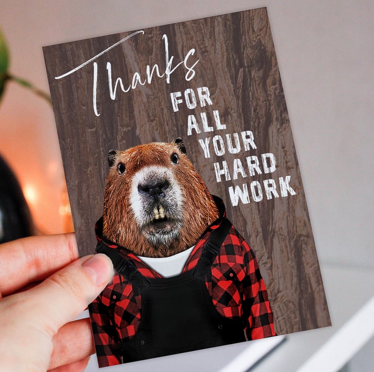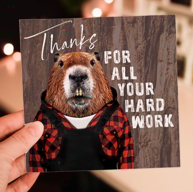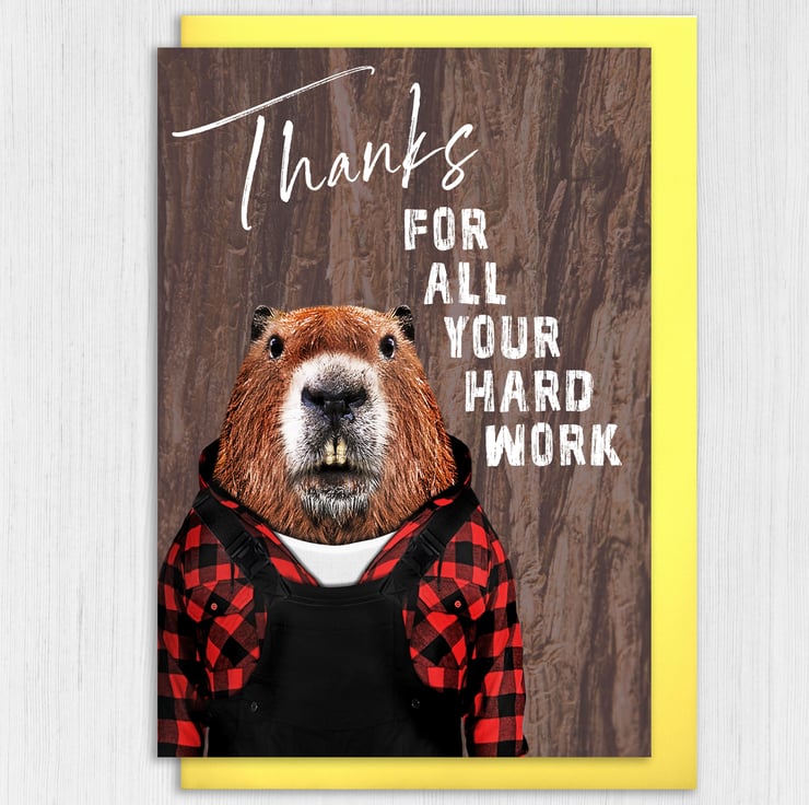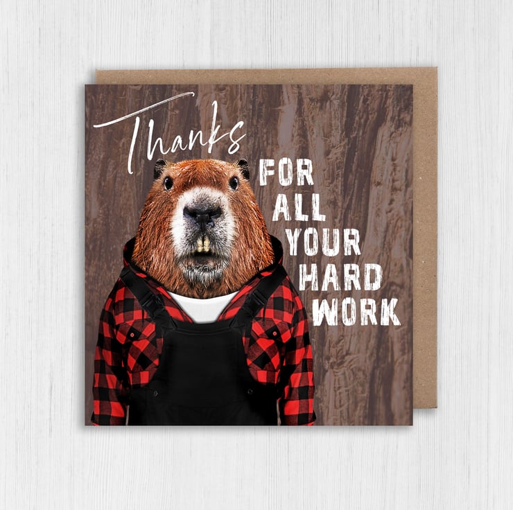 Beaver in clothes thank you card for staff, colleague, employee, friend, student, pupil: Thanks for all your hard work (Animalyser)
