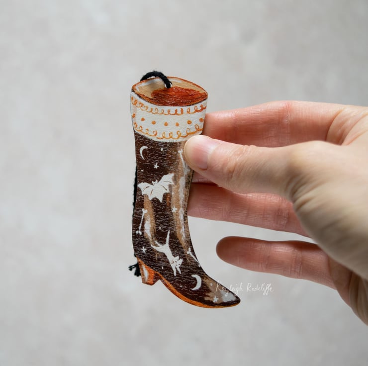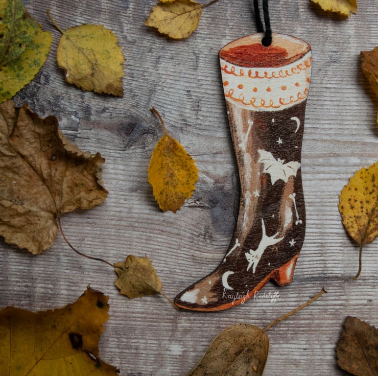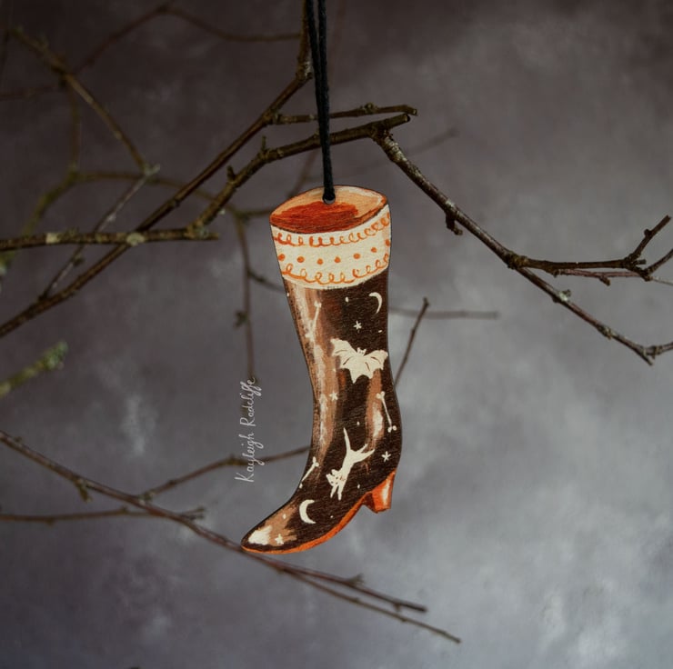 This boot is a double sided wooden hanging decoration, which features a bat and cat motif.