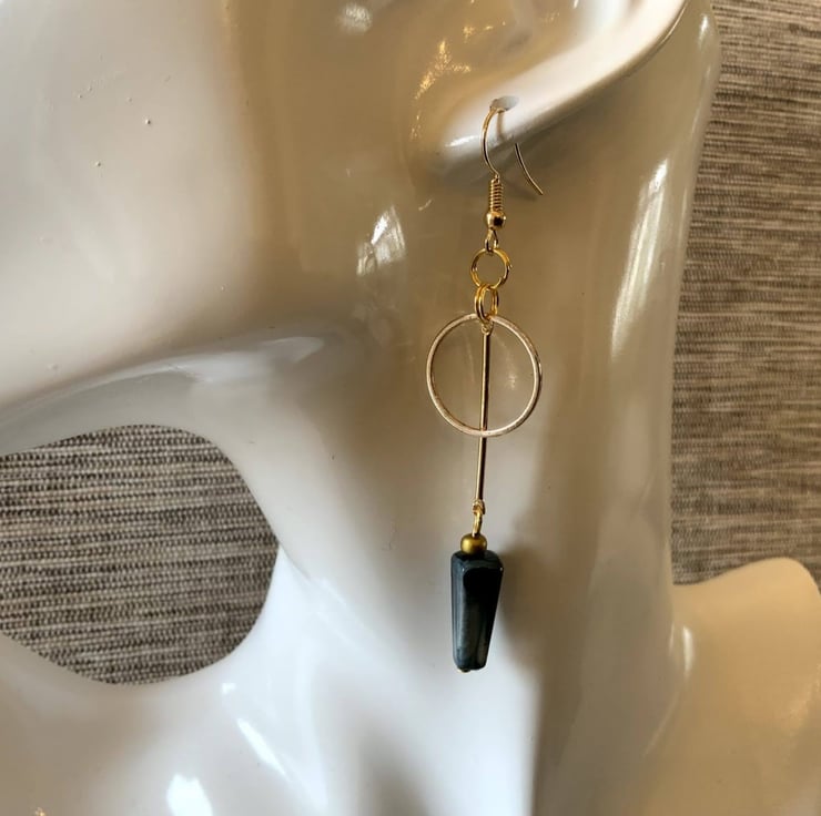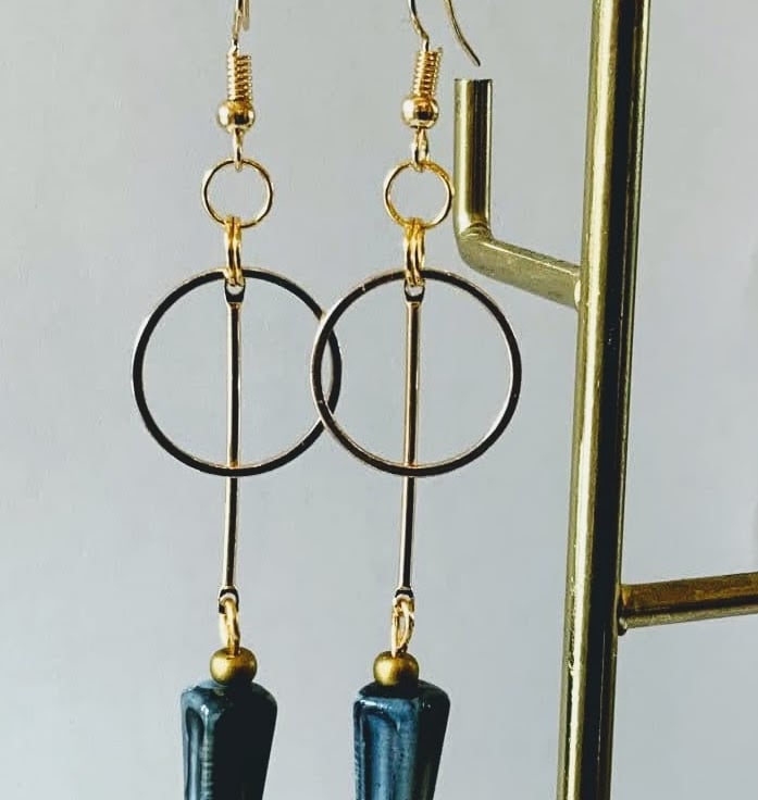 Gold colour hoops with hanging gold rod pin. Featuring a teal geometric bead with old gold mini rochelle. The teal bead has a white pattern flowing through it which is very eye catching in the light.