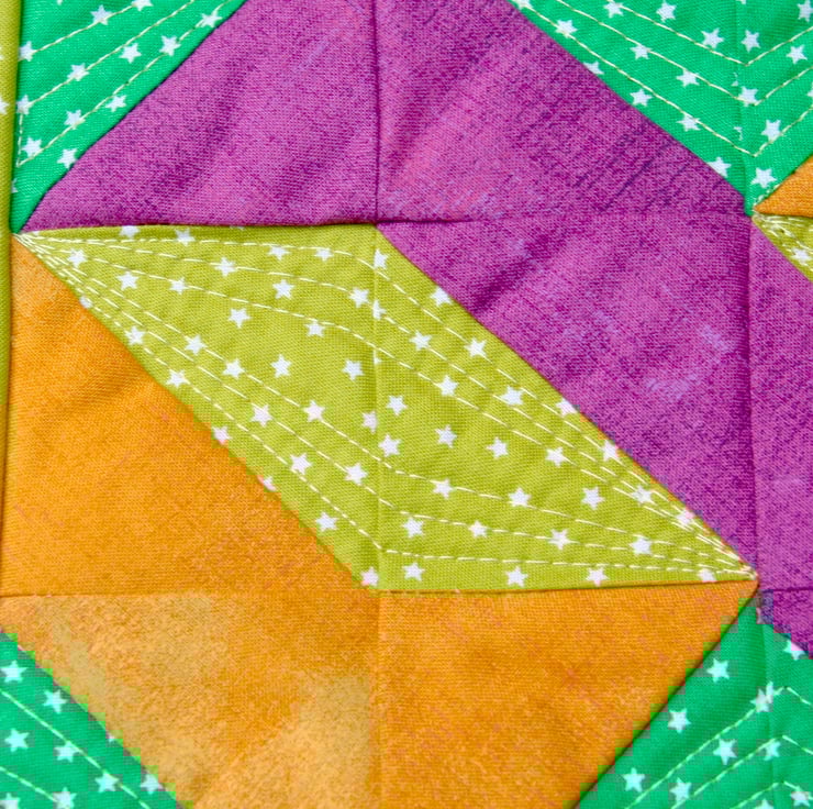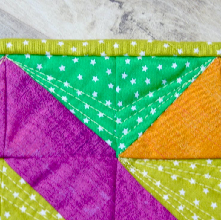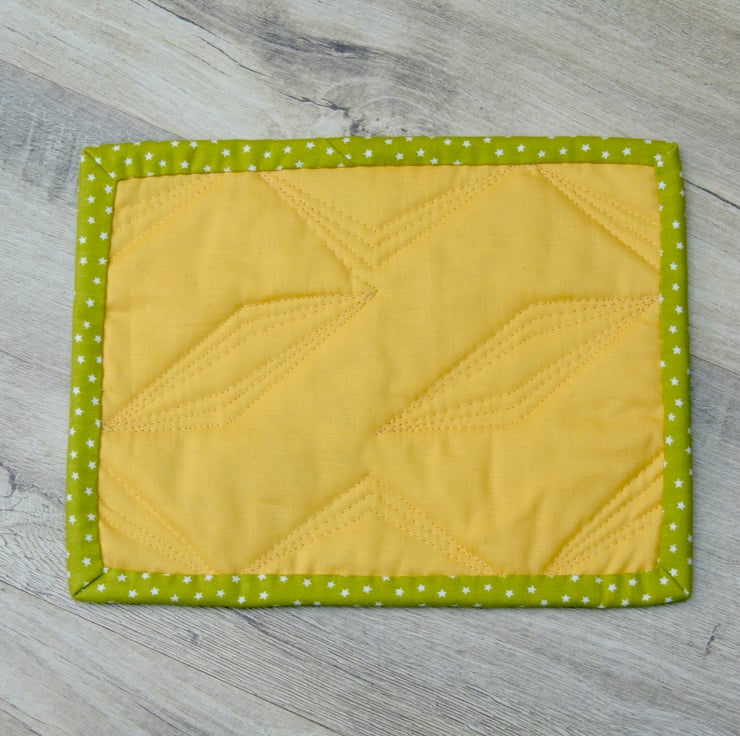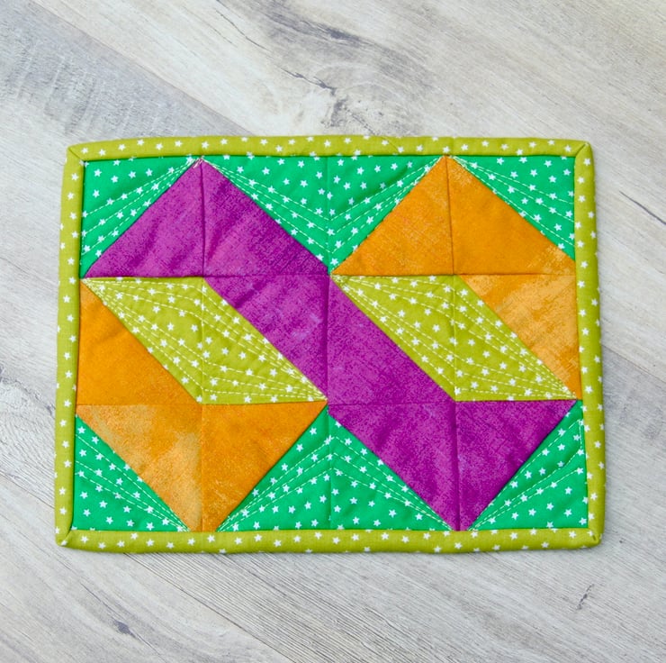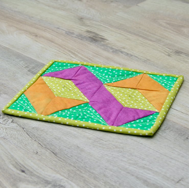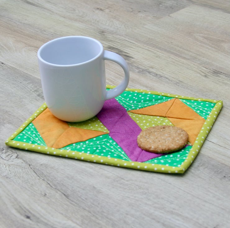 This bright and colourful mug rug, in a twisted pole patchwork design, is big enough to accommodate your drink and a cheeky biscuit.