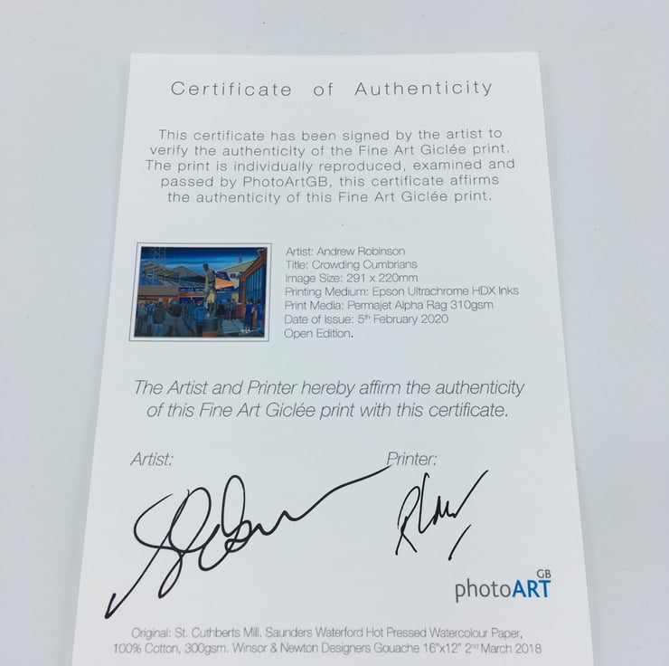 The framed print comes with a 'Certificate of Authenticity' which documents the details of the original painting and the art print. The Certificate of Authenticity is affirmed with a signature from both myself (the artist) and the printer.