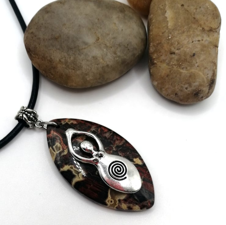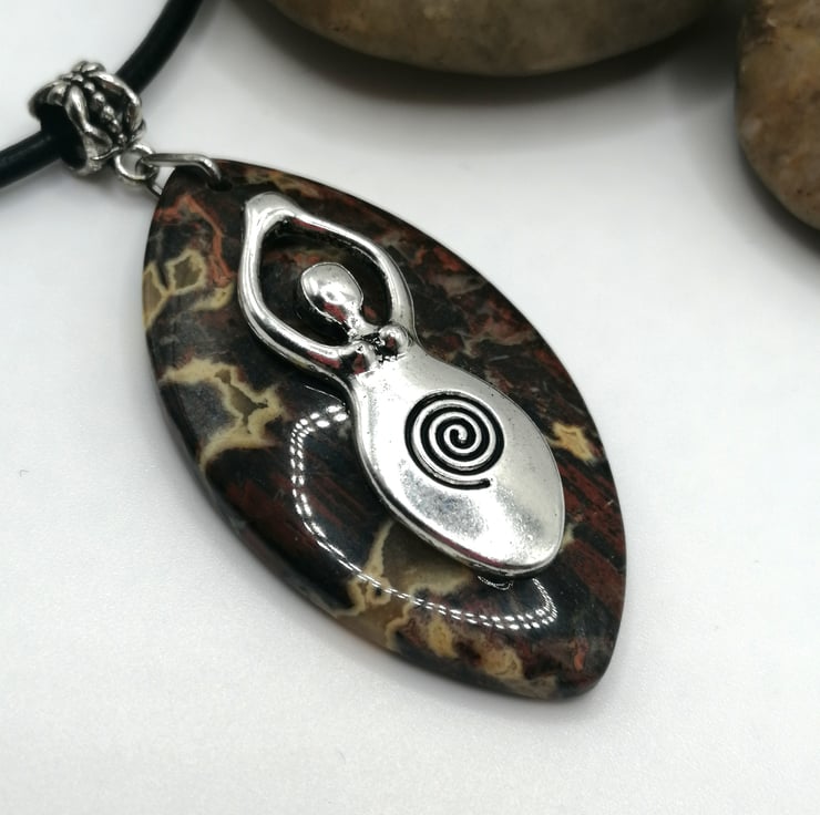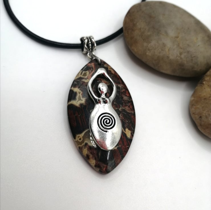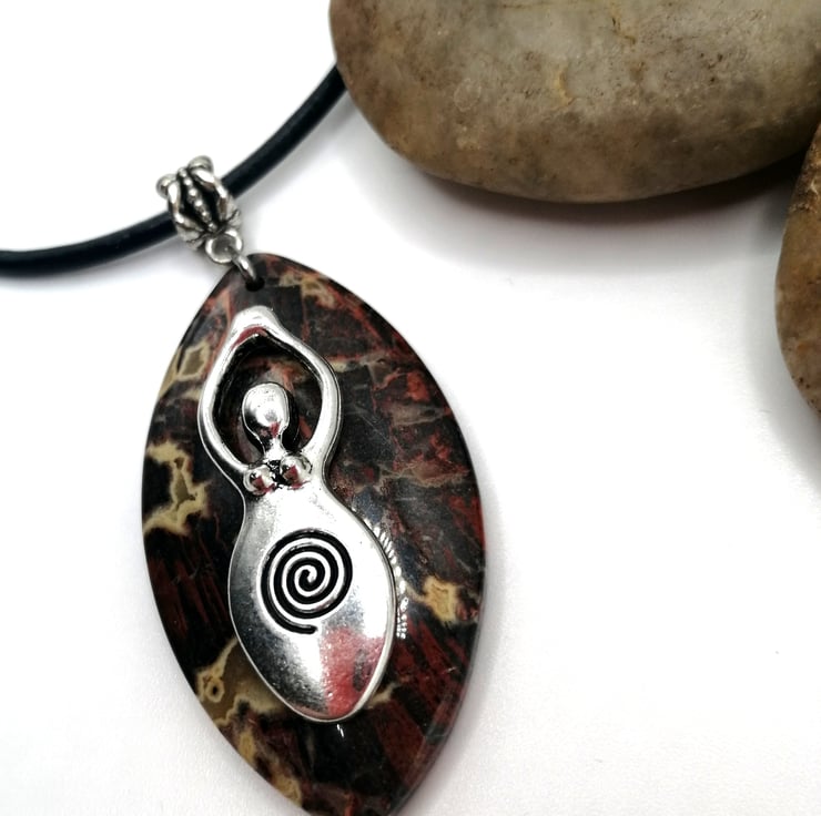 This stunning piece is made from leopard jasper. I added the silver plated goddess charm which I think looks wonderful. Please leave me a message with your choice of necklace and length. I am able to offer black or brown leather or silver plated chain. If I do not receive a message I will send a 18inch black leather necklace.