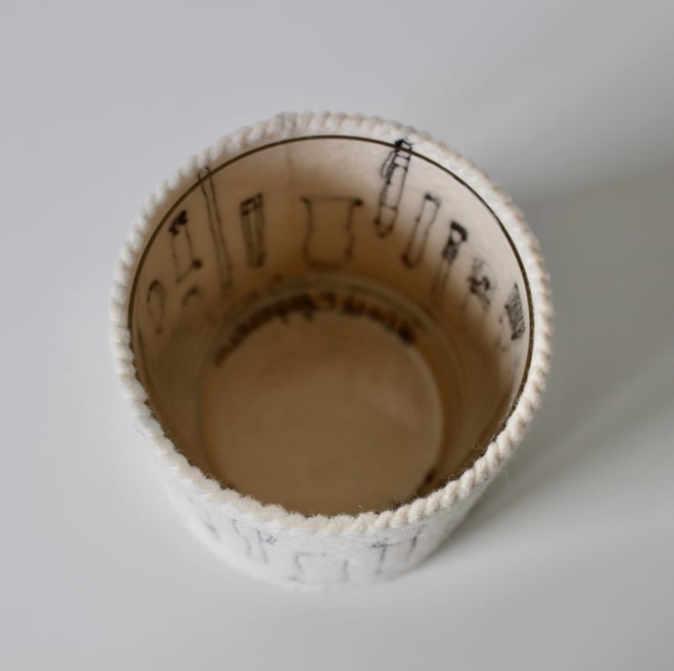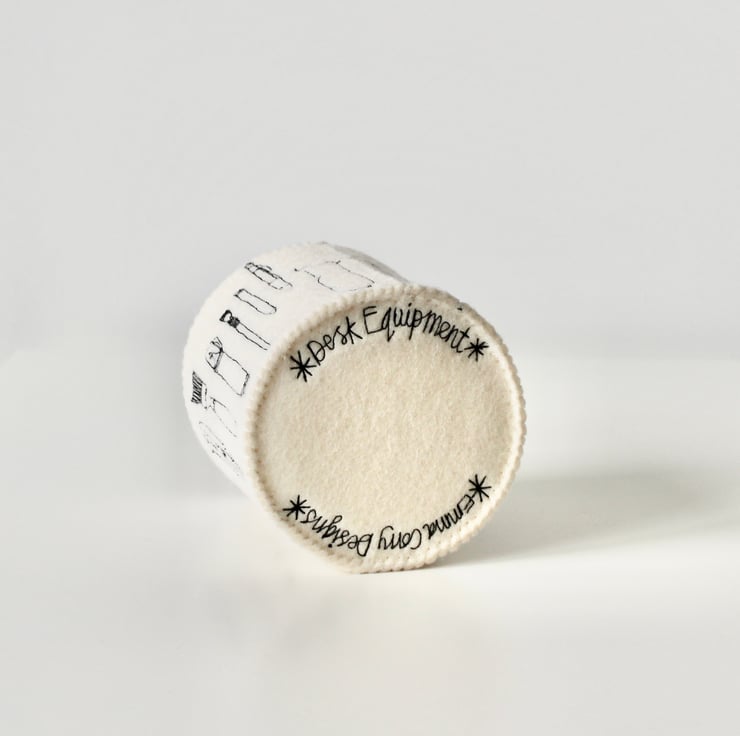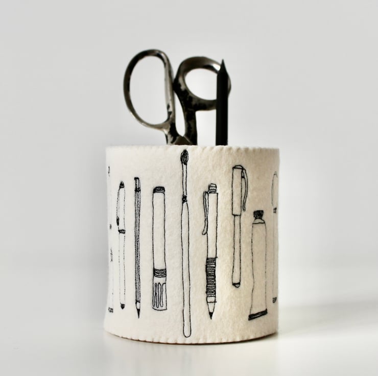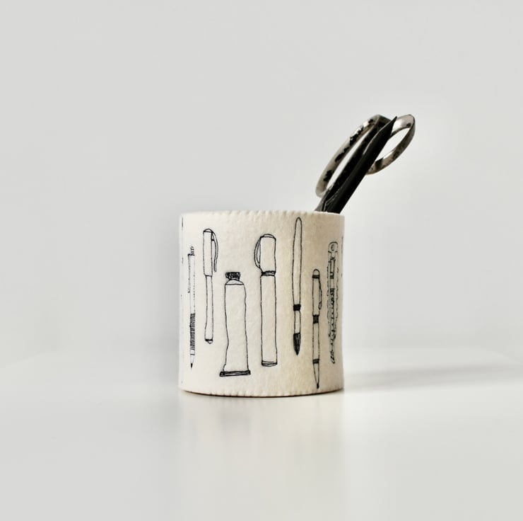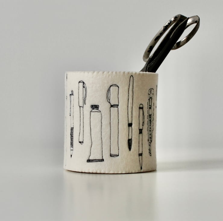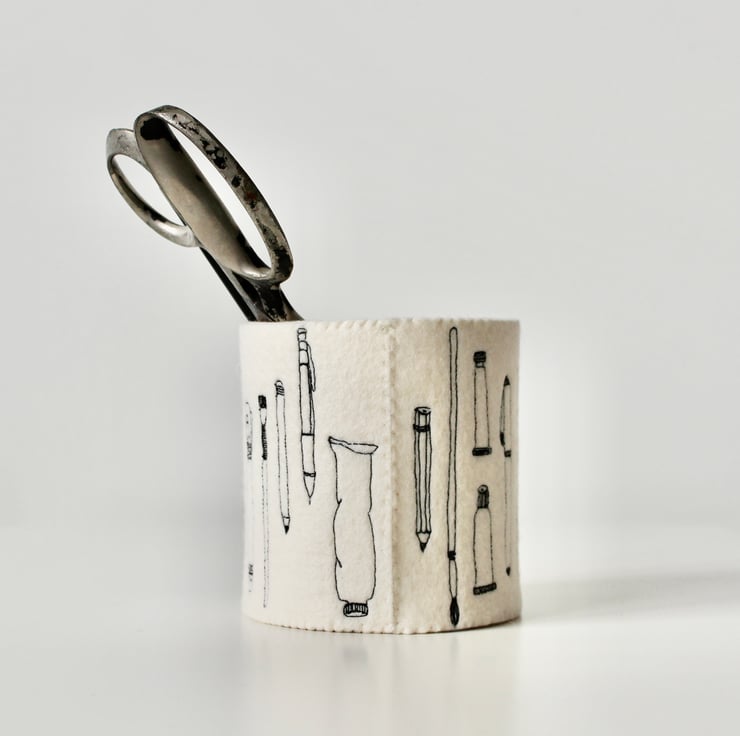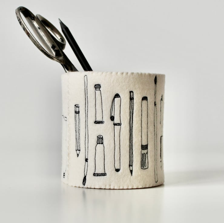 A unique 100% wool felt storage pot, adorned using free hand machine embroidery, with tubes of paint, paint brushes, pens and pencils.
