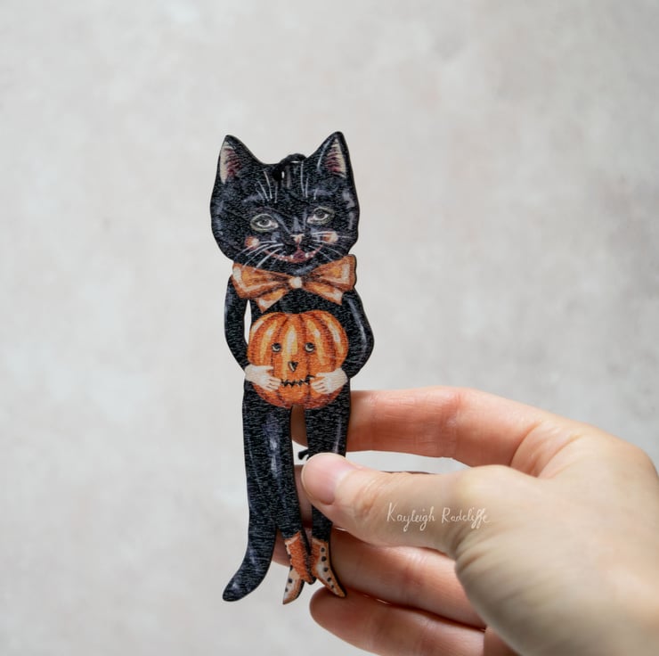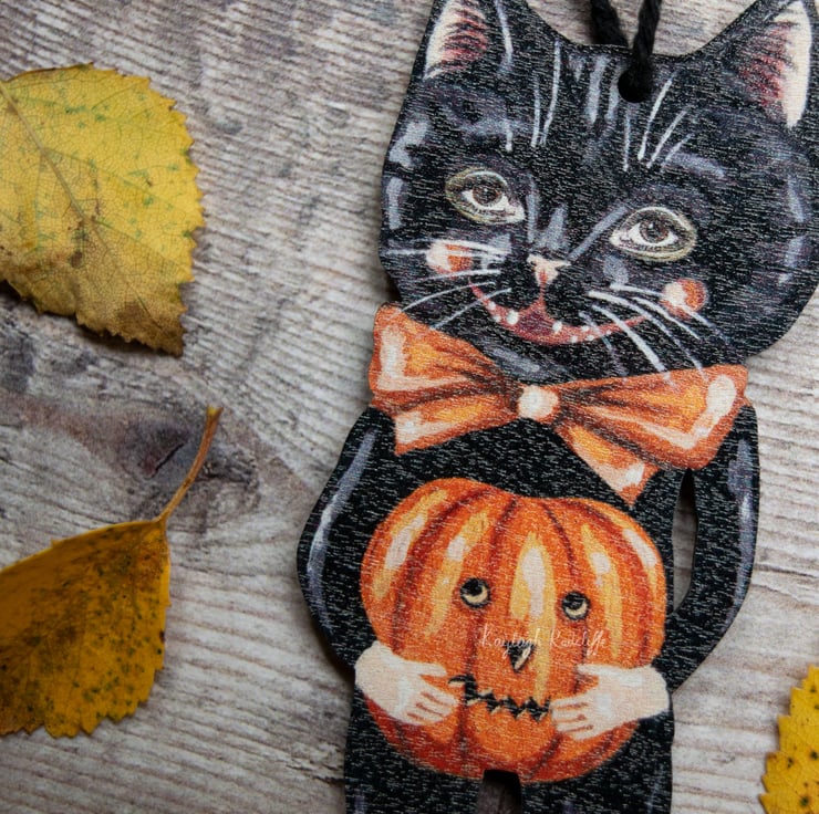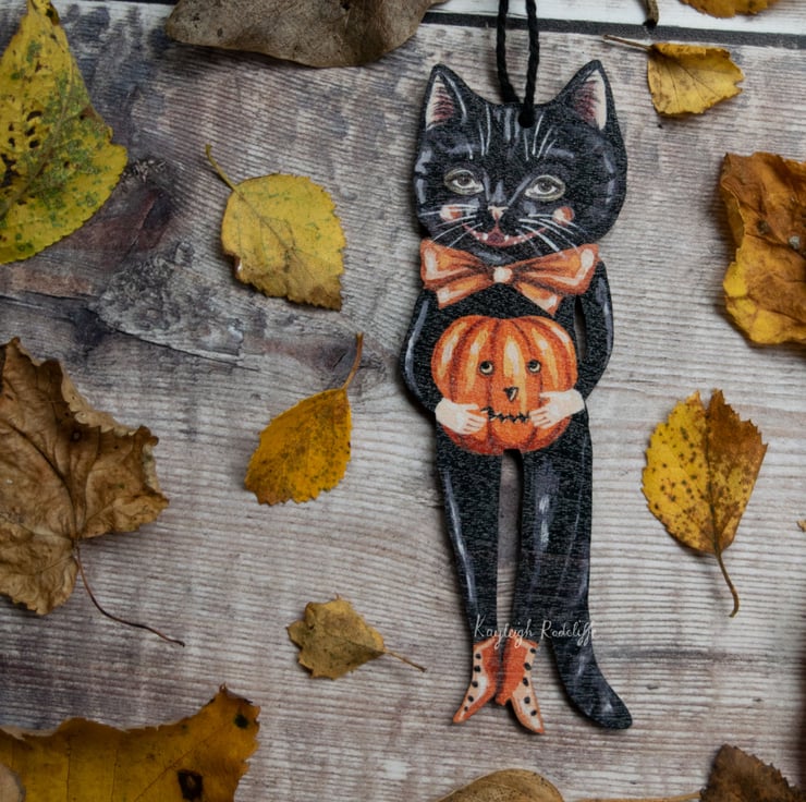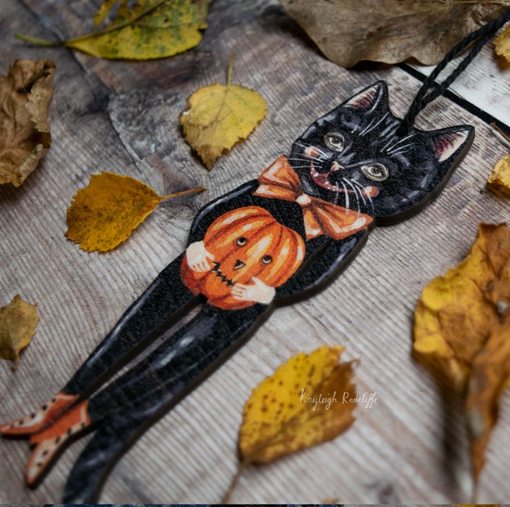 A laser cut wooden decoration of my character Noir the black cat, ready for his night of trick-or-treating. He'd be purrrrfect for your Halloween decor!