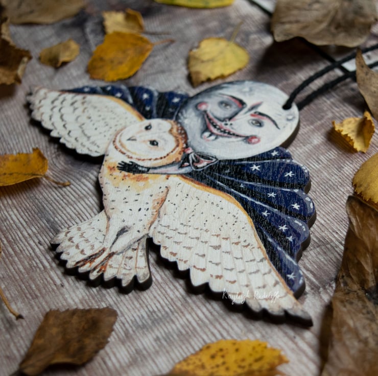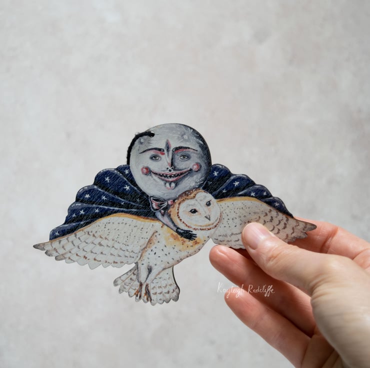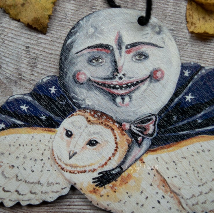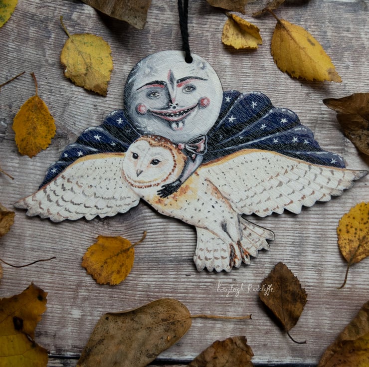 A creepy but cute laser cut wooden decoration of my character Herman the moon man flying through the dark of night with his barn owl friend. Look up in the sky tonight, you might just see them!