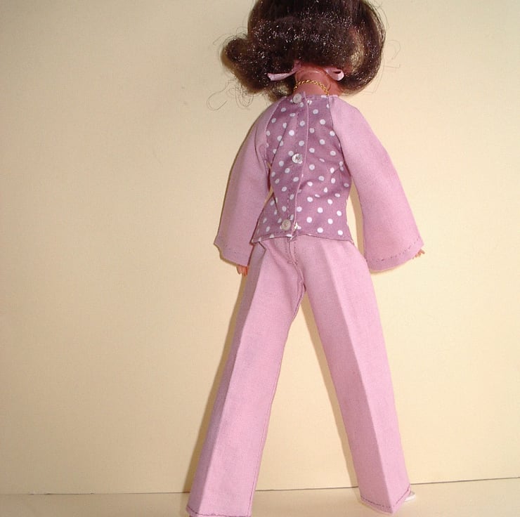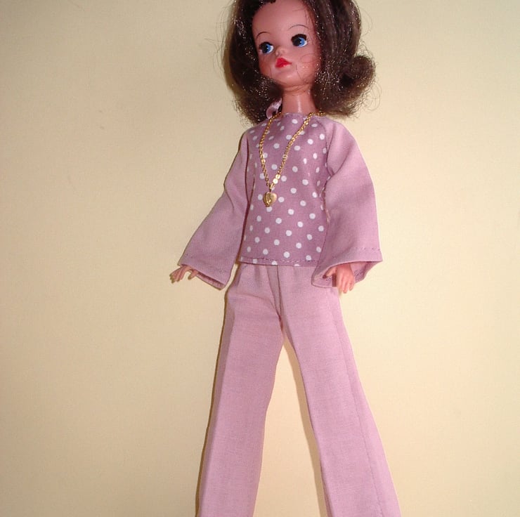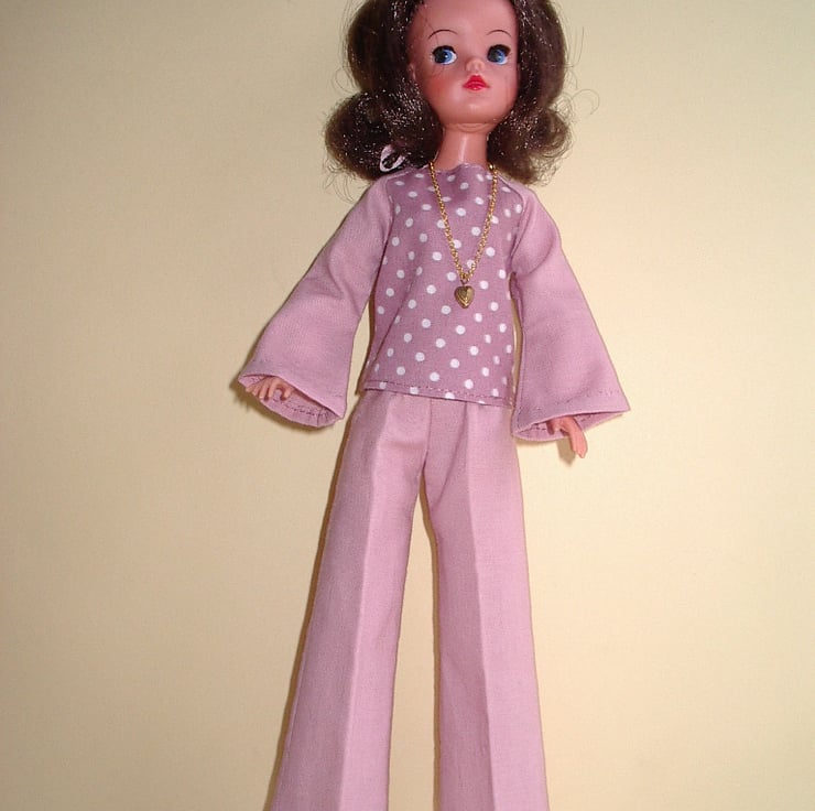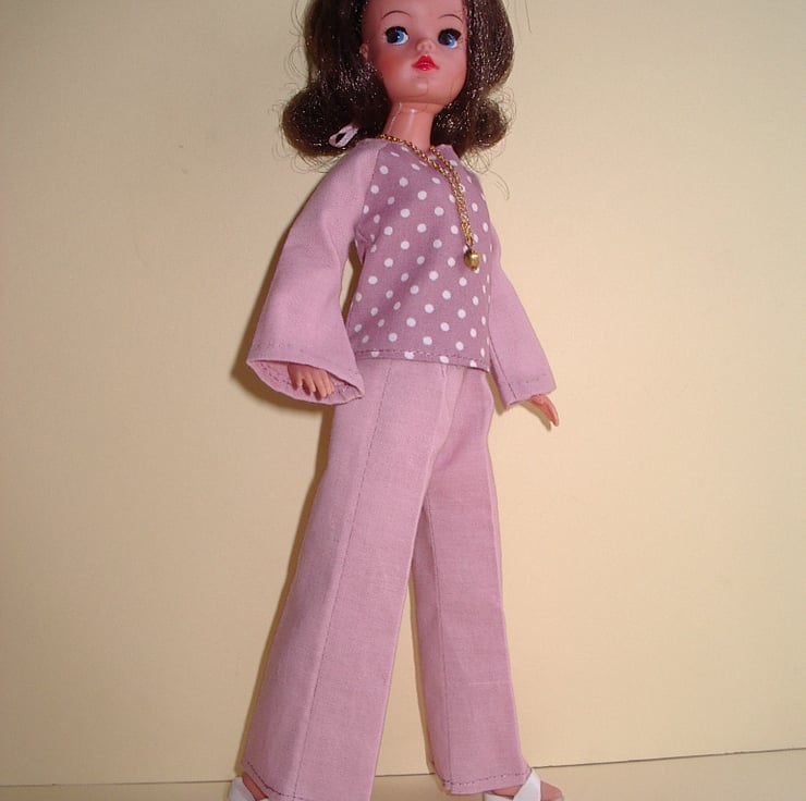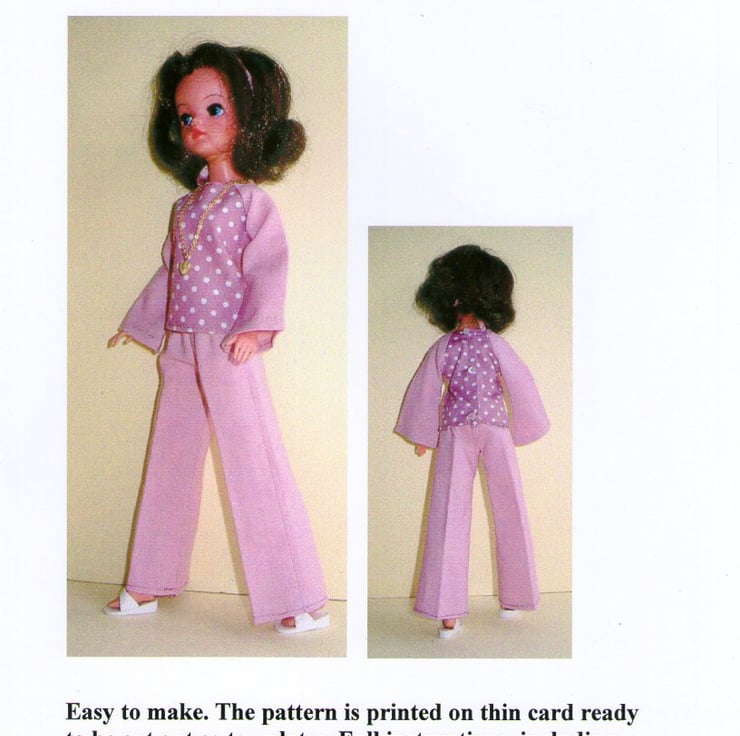 This pattern is for a pair of 1970's style, flared trousers and a matching top. It is designed to fit Sindy or other similar 11-12" fashion dolls.