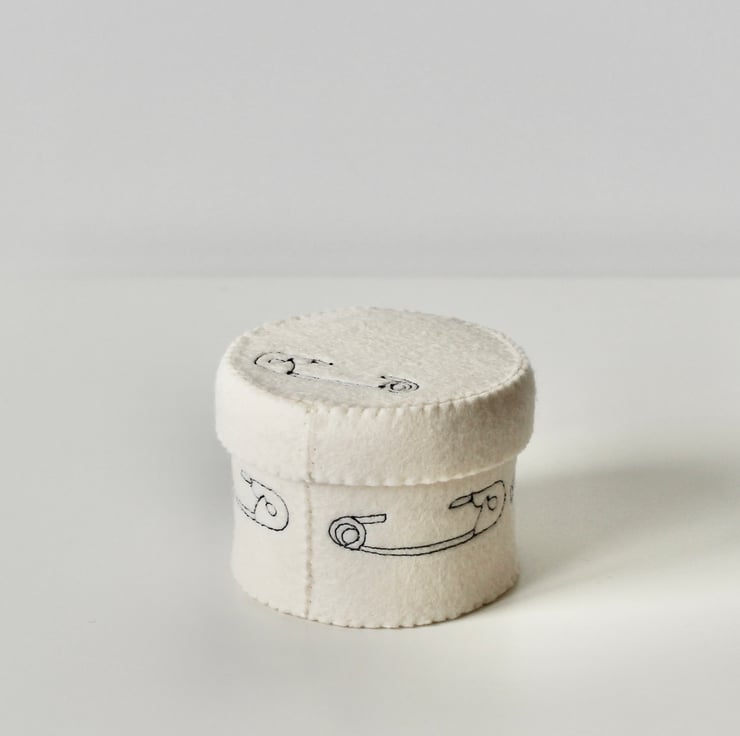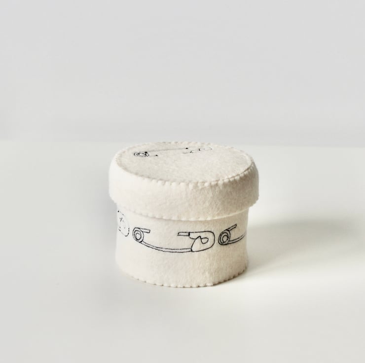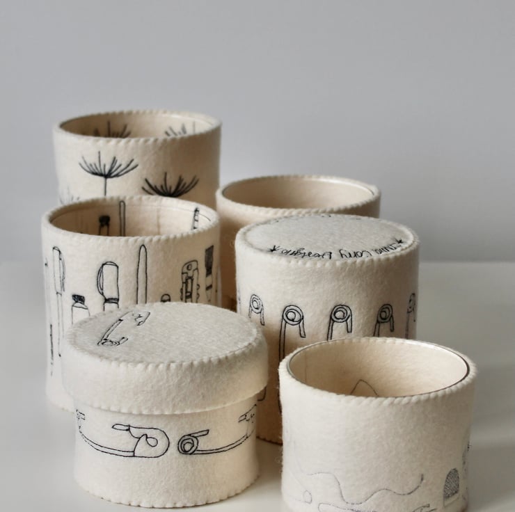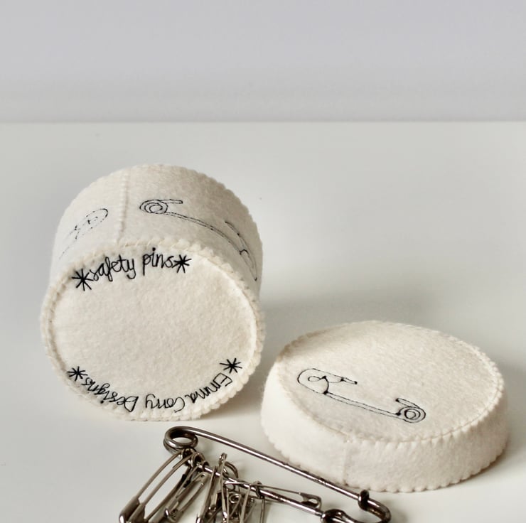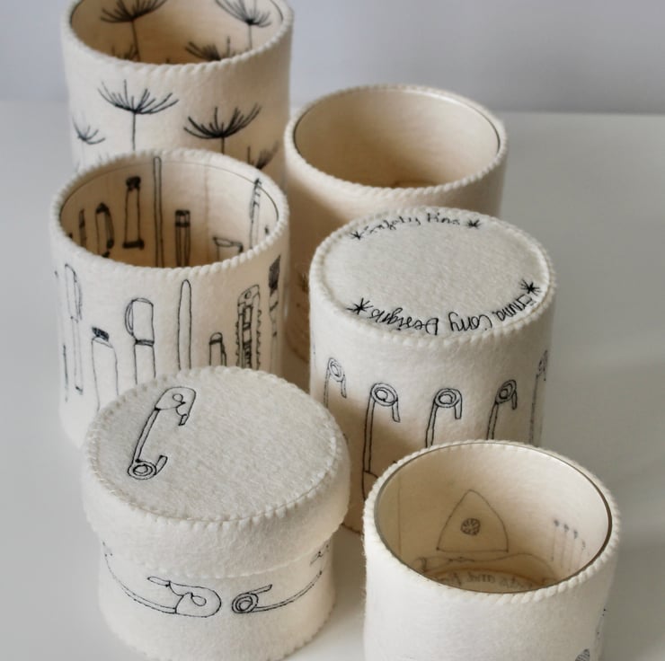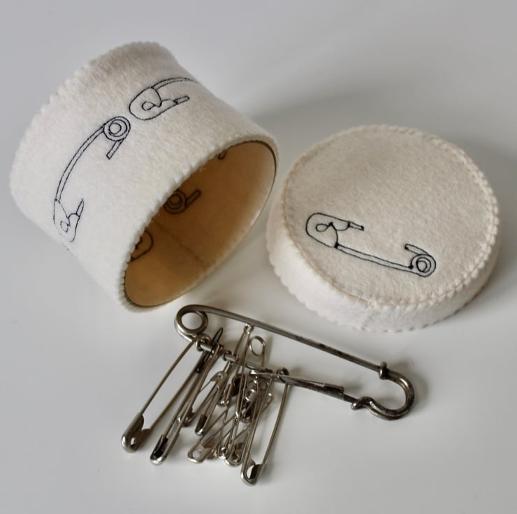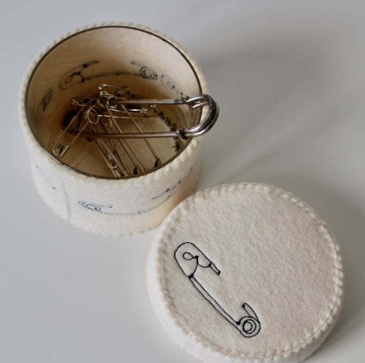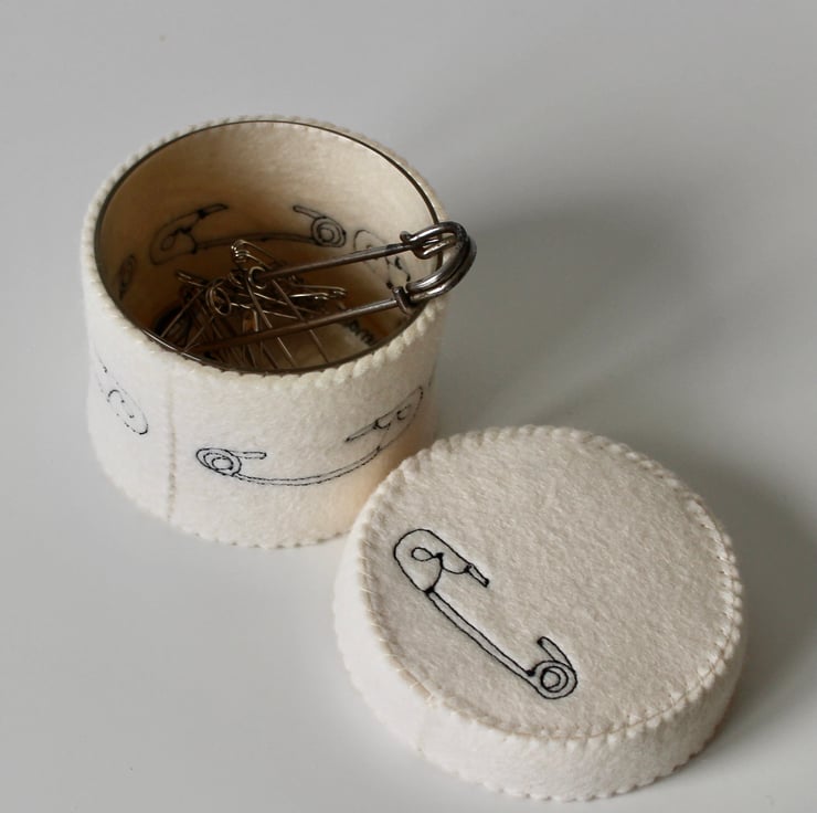 A unique 100% wool felt lidded storage pot, adorned using free hand machine embroidery safety pins.