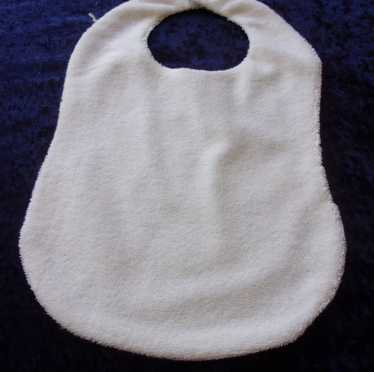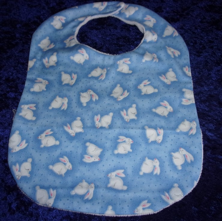 The design on the fabric used is of white rabbits on a blue background. It is backed with Stretch Terry Towelling with a Velcro fastening at the neck so it is easy to put on and take off before and after feeding baby.