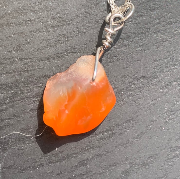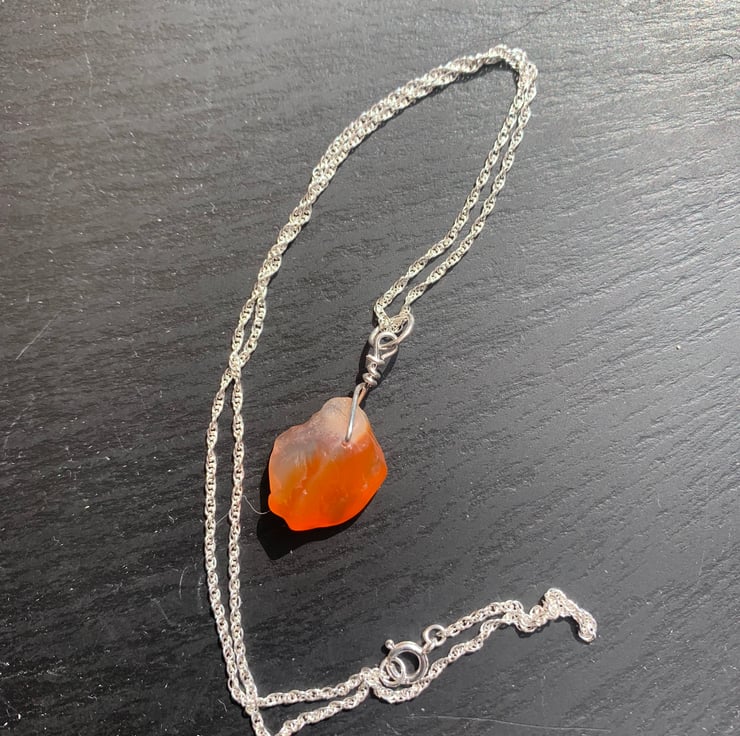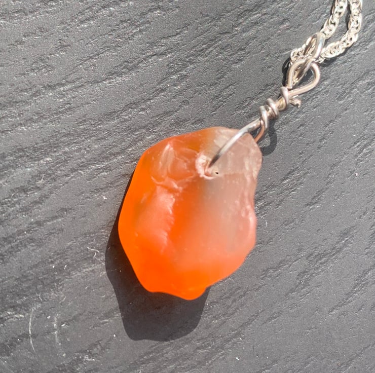This lovely natural carnelian stone has been drilled to create a pendant drop and is attached to an 18inch Sterling silver rope chain with a hand crafted sterling silver wire bail. I have only recently identified some stones that I have collected as carnelian and I am excited to be offering such a beautiful coloured stone in my shop. The stone has been dealt with in the same way as the seaglass I use. It has 3 faces, but the larger face makes a natural back to the drop.