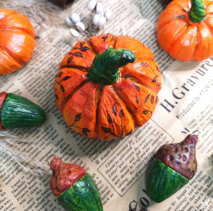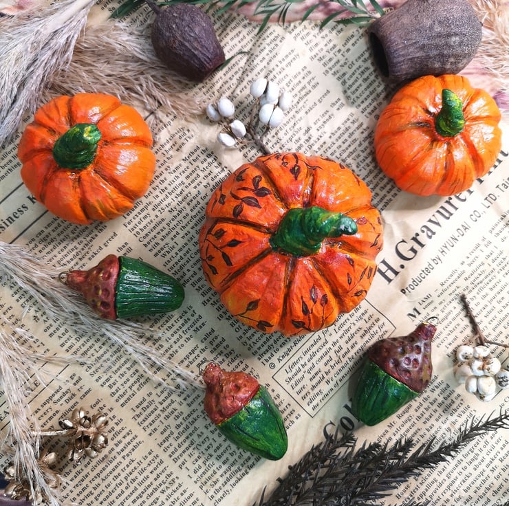 Air dried clay pumpkin, hand painted with acrylics and varnished to protect. To maintain the vibrancy of them, keep out of direct sunlight.