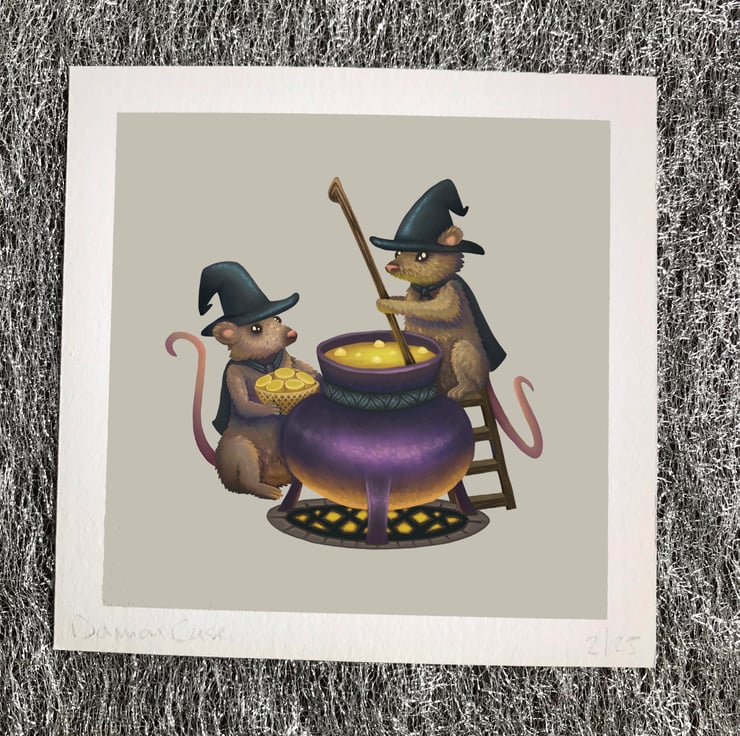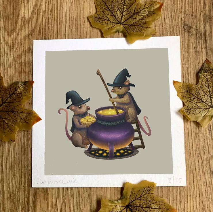 Be one of a select few to own one of these spooky witch mice limited edition art prints. rinted on 6" by 6" German etching paper with a 1” white border. Printed to order so can take up to 14 days to arrive. Print is numbered and signed by DuffleCat Prints artist Damian Case. Print is unframed.