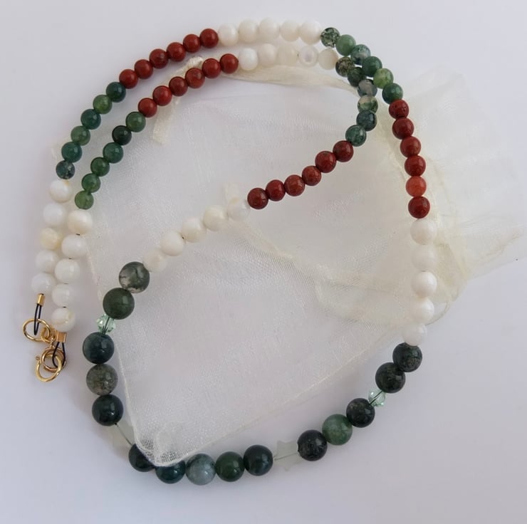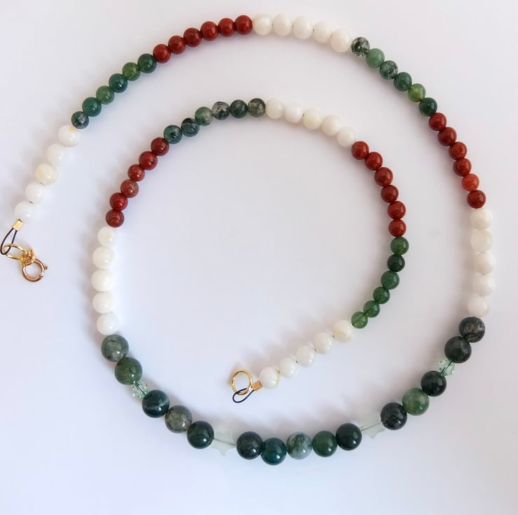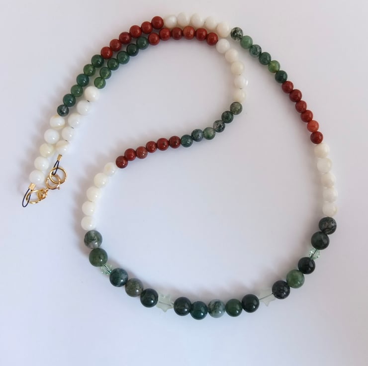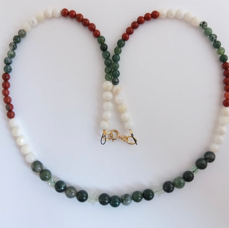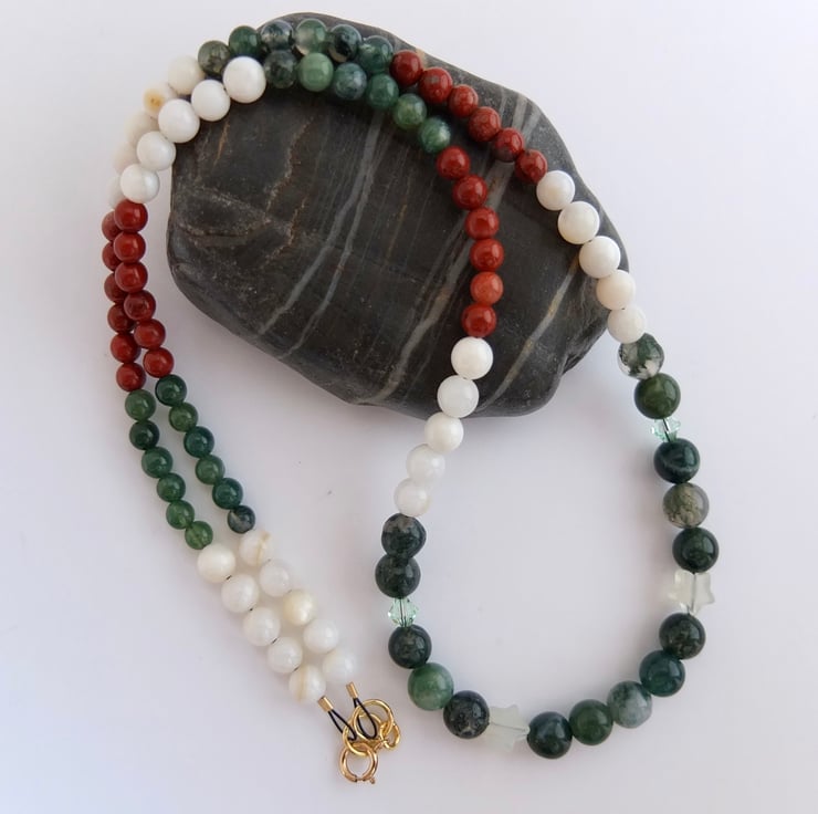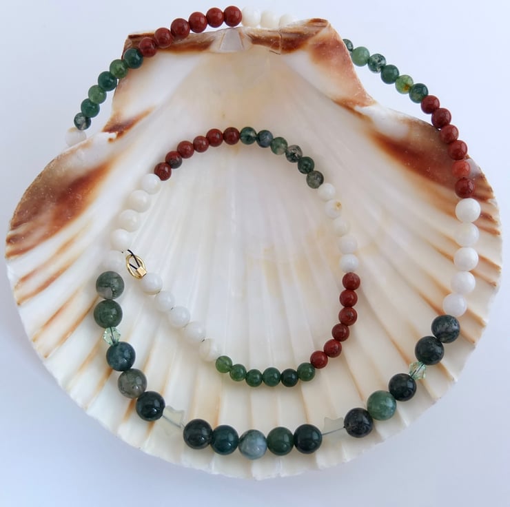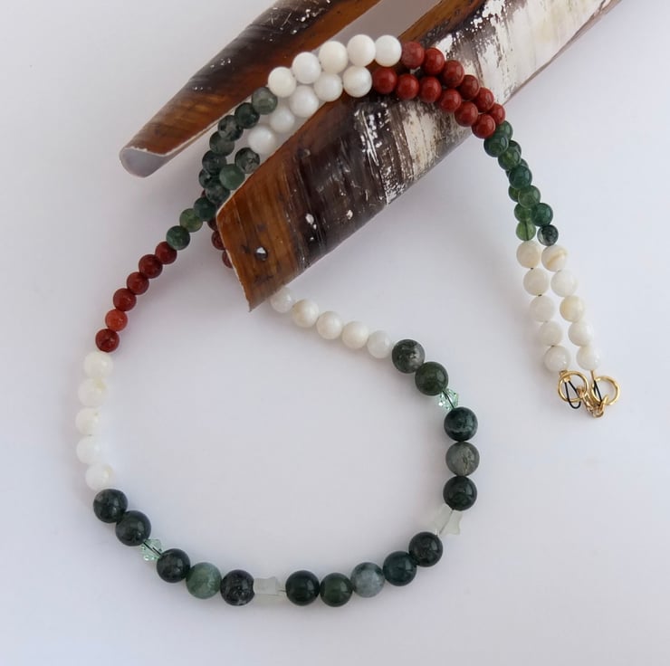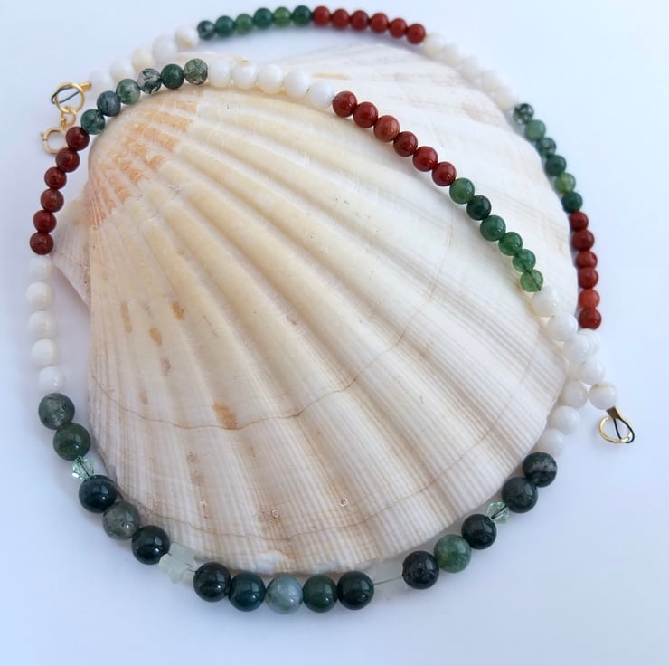 The necklace then graduates to 5mm shell and 4mm moss agate and red jasper.