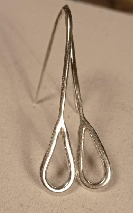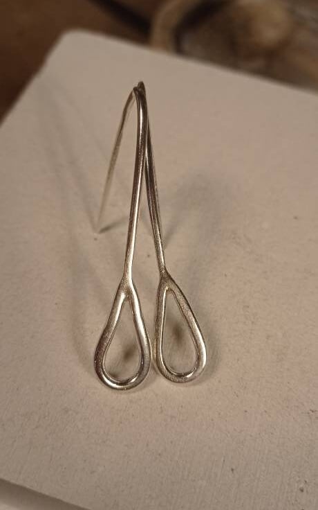 Lovingly hand formed from start to finish, the droplets of silver have been made by soldering 1.5mm silver round wire into a teardrop shape. Then using a technique called 'planishing', they have been slightly textured to create a slightly bumpy and wonky finish. The earring is a continuous piece, which also makes the 'ear wire', slightly thinner for a comfortable fit, its secure and will stand the test of the time to be lovingly worn over and over again.