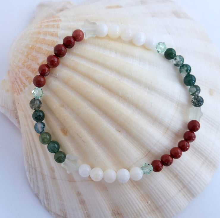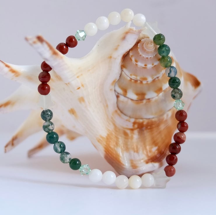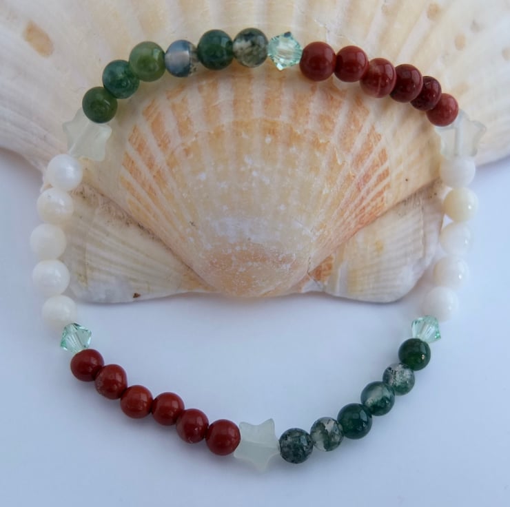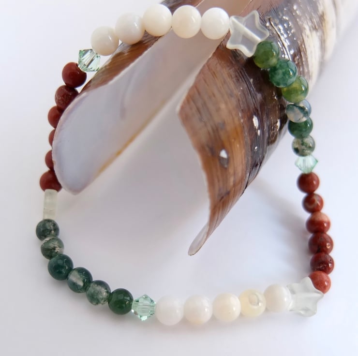 I have alternated beads of red jasper, moss agate and shell, separating them with a pale green jade star or a sparkly Swarovski crystal in a colour called "chrysolite".
