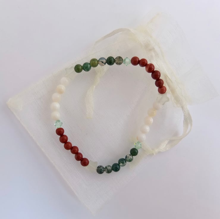 A pretty, dainty stretch bracelet in hues of sage-green, red-brown and creamy white.