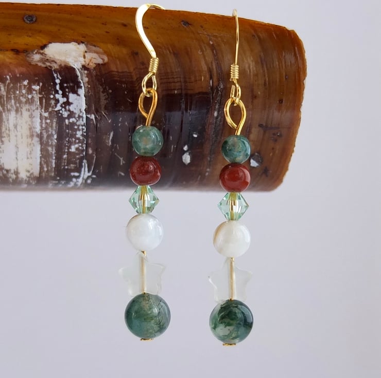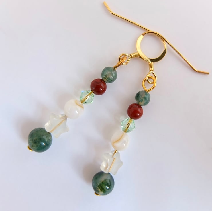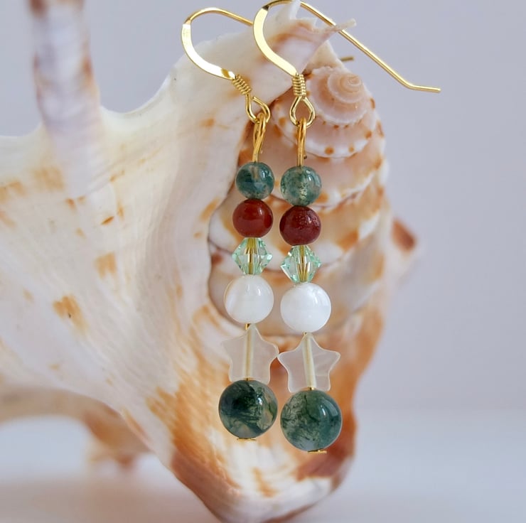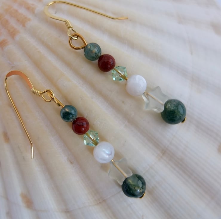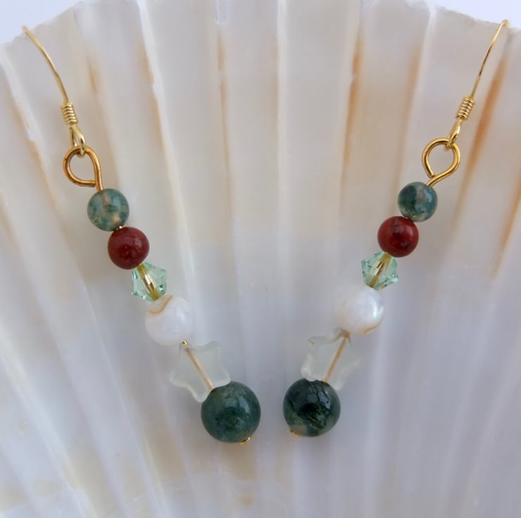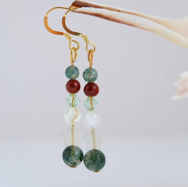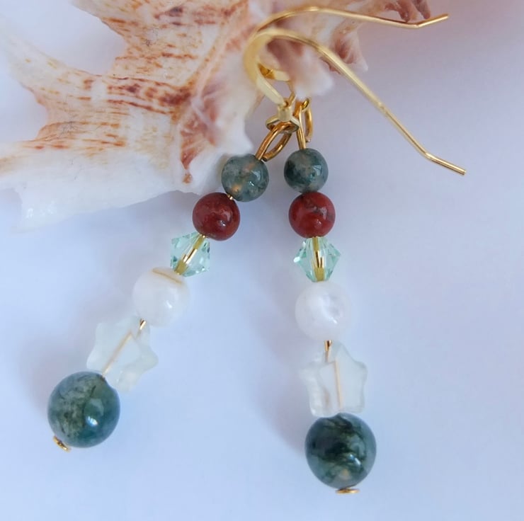 Pretty drop earrings featuring a 6mm moss agate bead, a jade star, a creamy white shell, a sparkly Swarovski crystal in the colour "chrysolite" and 4mm beads of red jasper and moss agate.