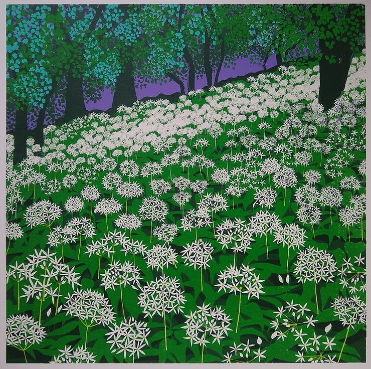 This image is inspired by a local wood in Crich in Derbyshire during wild garlic season - so beautiful! I once painted a similar scene in acrylics using a purple base layer, which is probably why I had it in my head all along that the sky had to be purple!