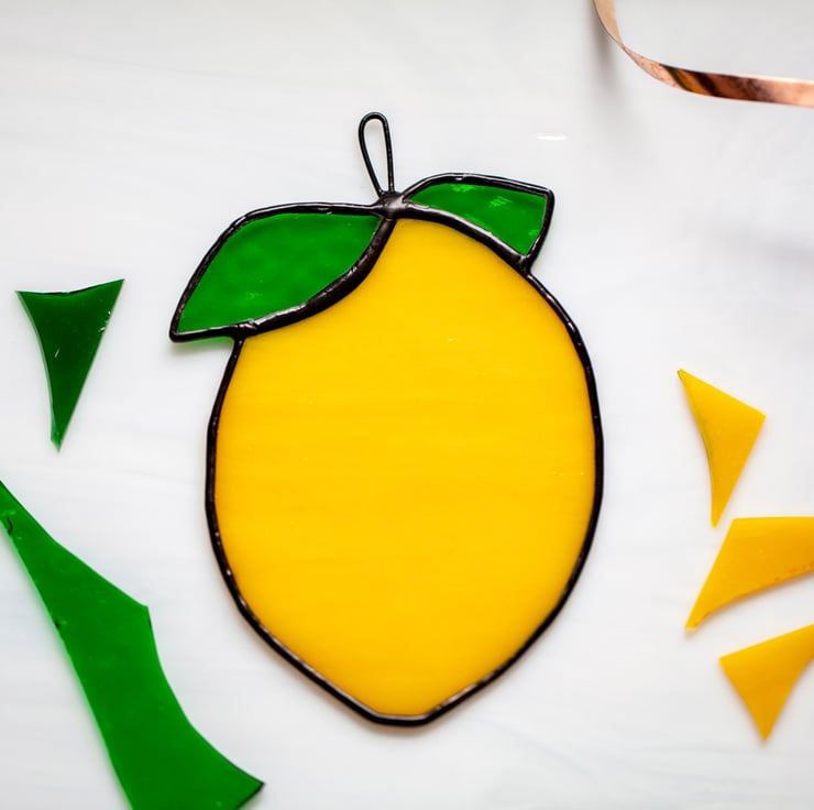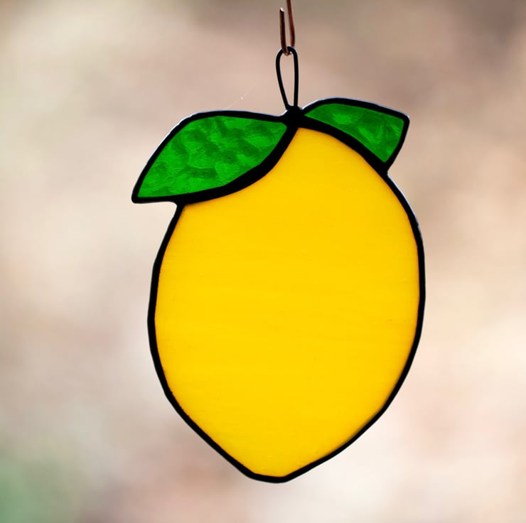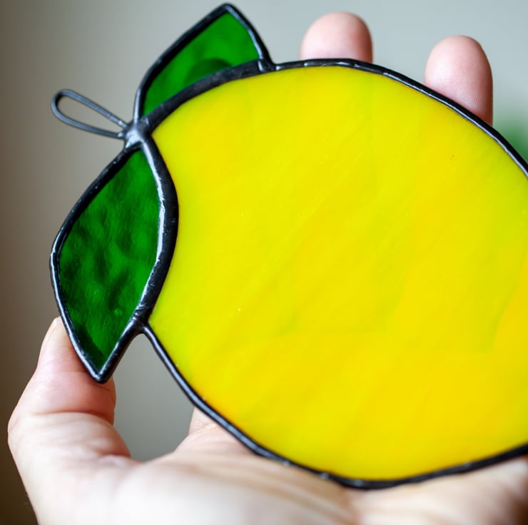 Here it is for you something pretty – a juicy lemon. Made of beautiful yellow glass and a bit of copper wire. 13x10cm of yumminess. (HxW)