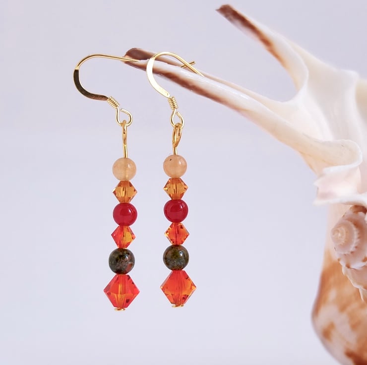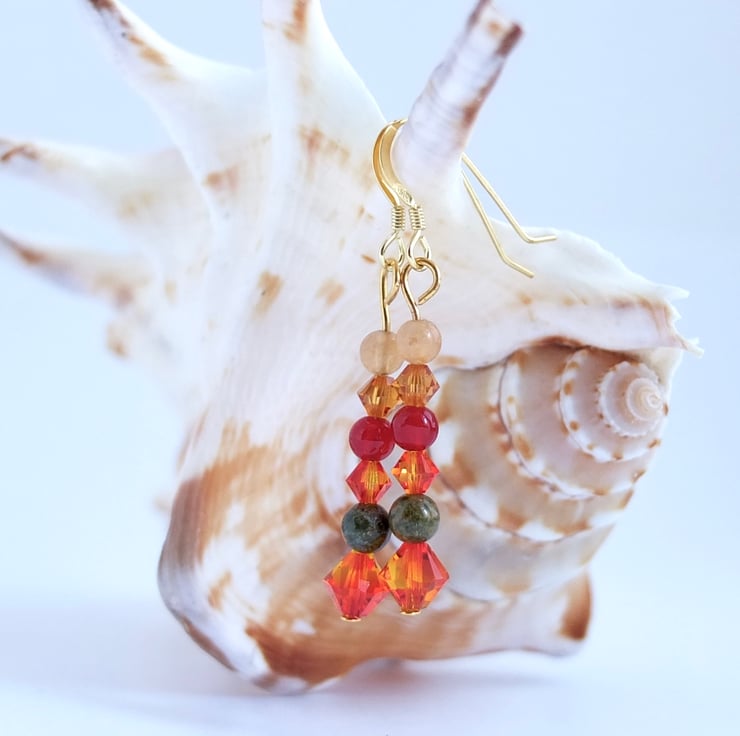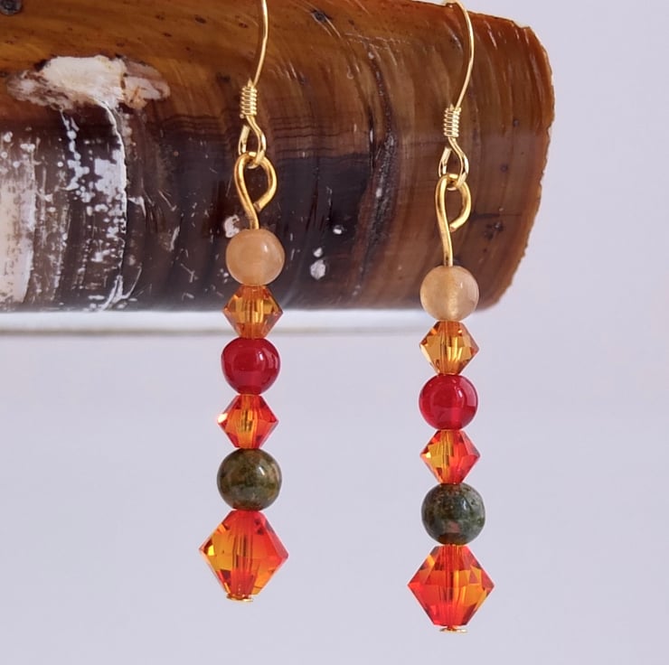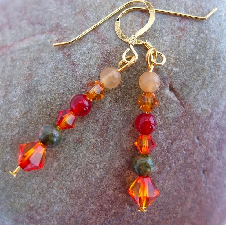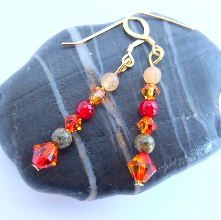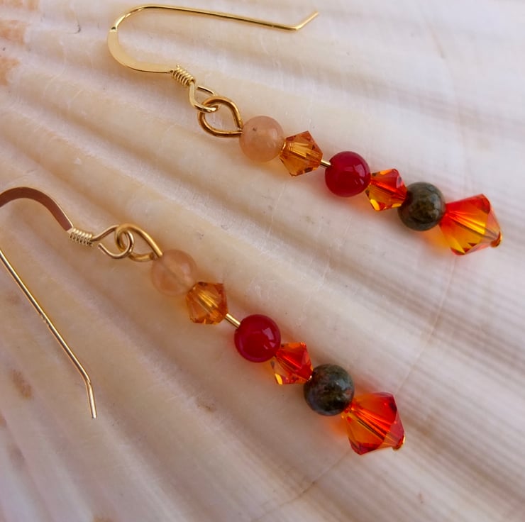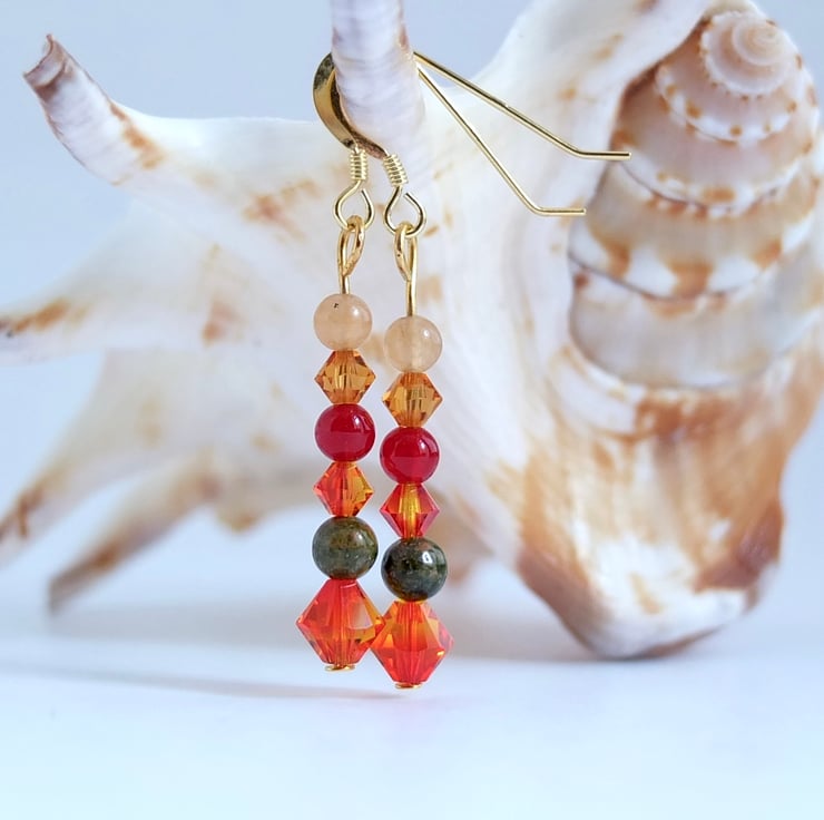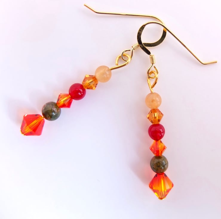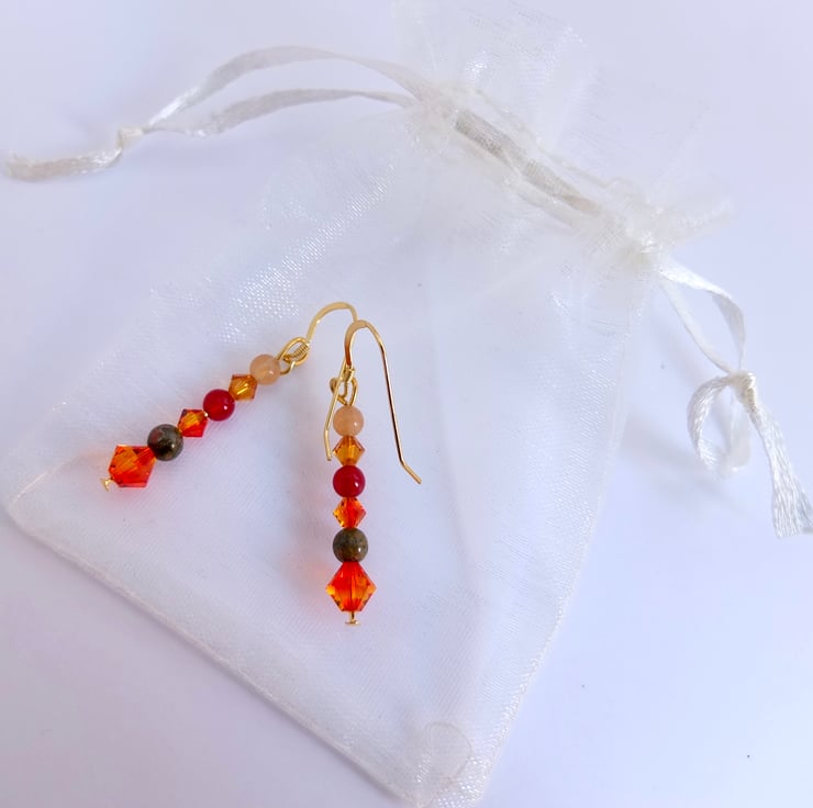 Autumn themed earrings featuring yellow and orange sparkly Swarovski crystal bicones in the colours "fire opal" and "topaz".