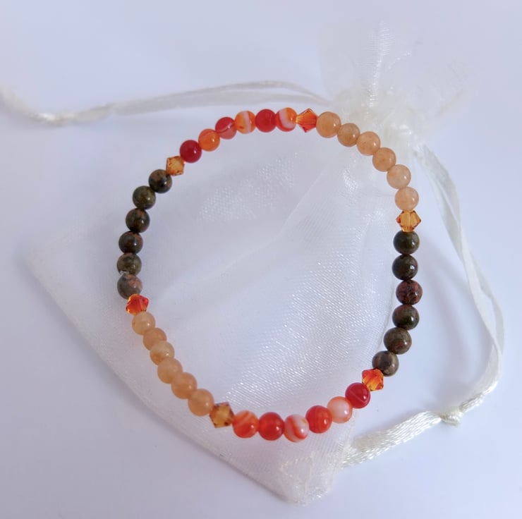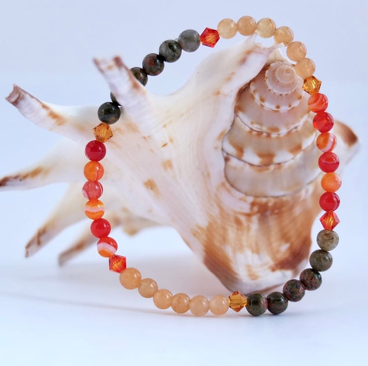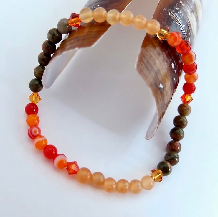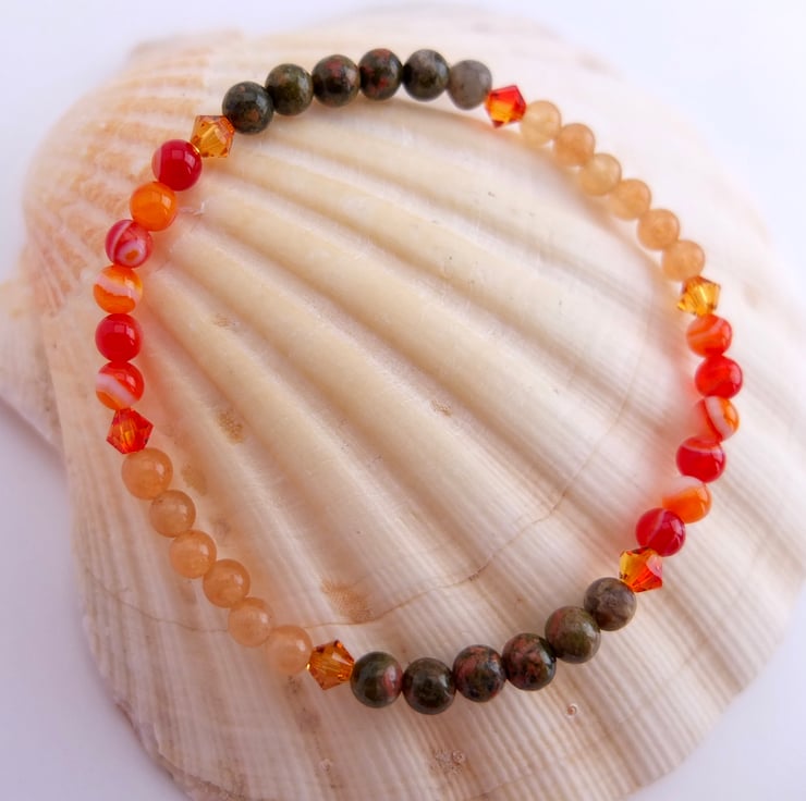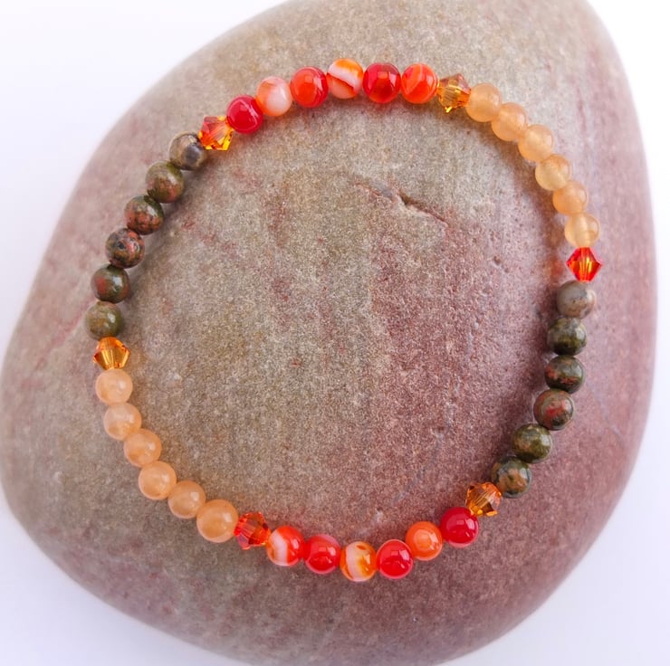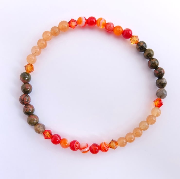 Lovely, dainty stretch bracelet in autumn hues of red, orange, yellow and green.
