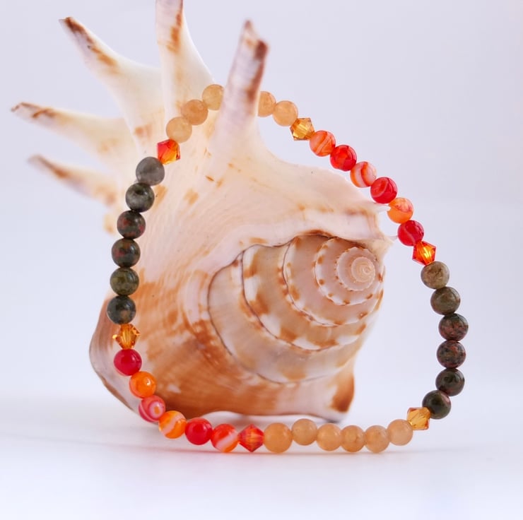 Beautiful red and orange agate beads, banded with white, soft peach aventurine and moss-green unakite speckled with pink and peach patterns are brightened with the sparkle of Swarovski crystals in "fire opal" and "topaz".