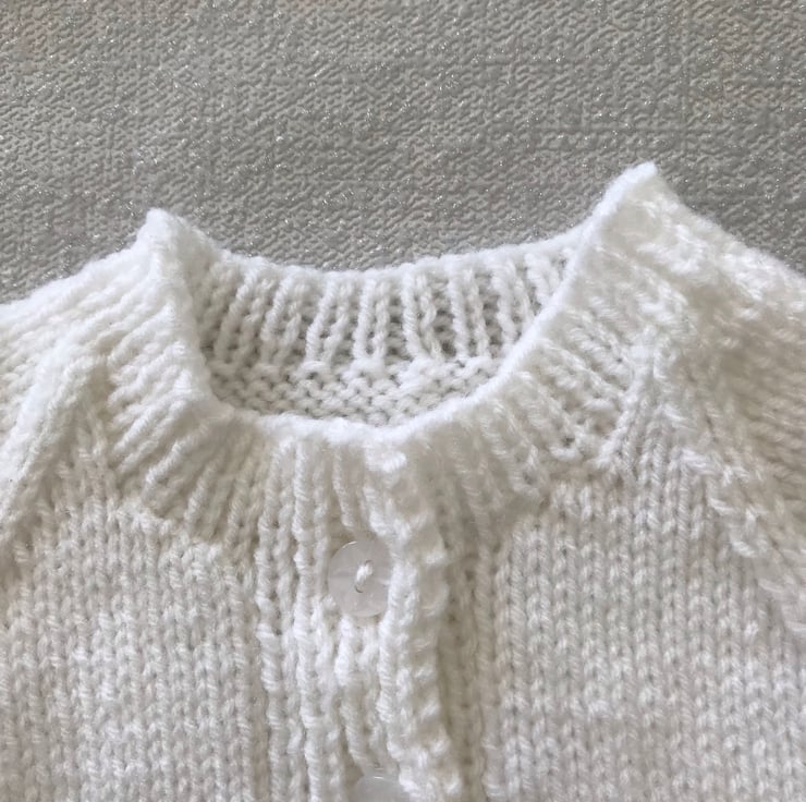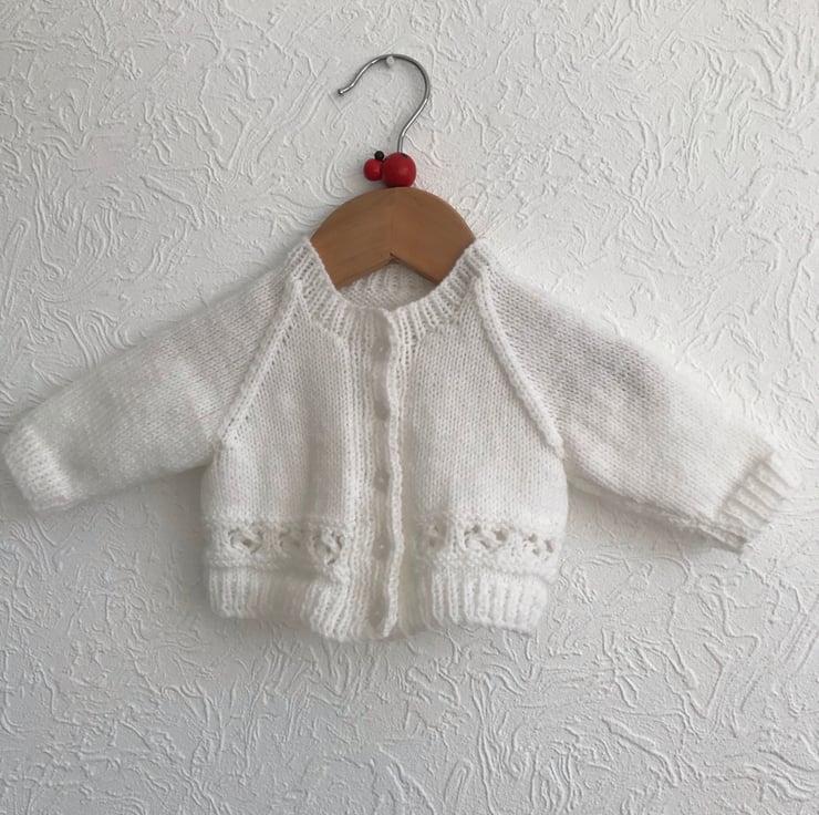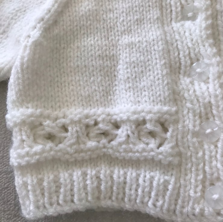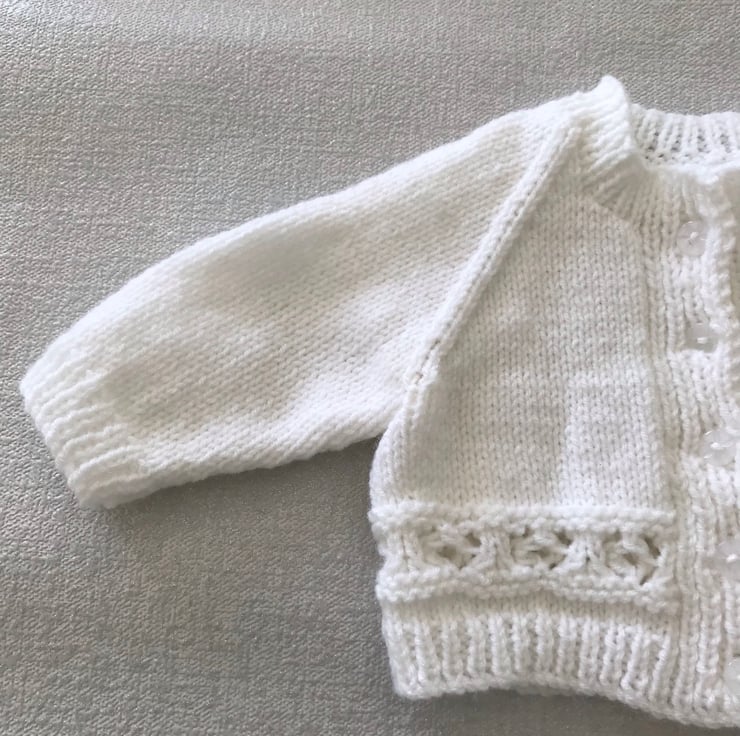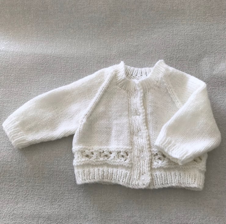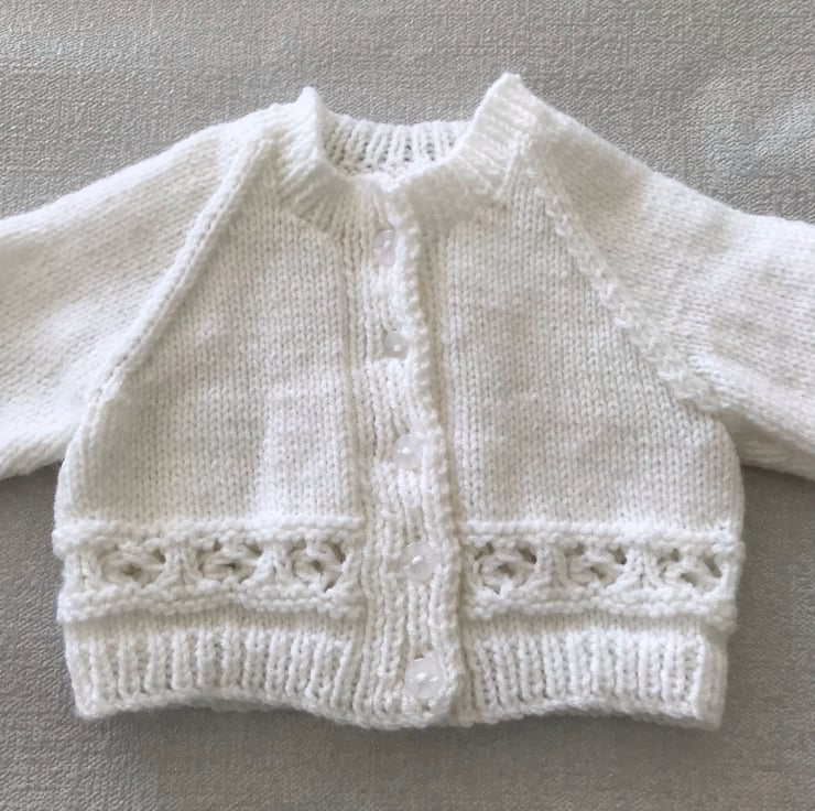 This white cardigan is hand knitted in a synthetic 4ply yarn. It has a band of pattern above the ribbed hem, a round neck and buttons up the front.