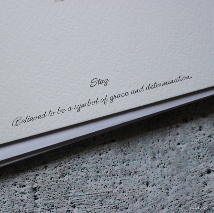 The stag design was originally hand drawn in graphite pencil by us a CottageRts before being printed on to A6 textured white 300gsm card to create a flat postcard. The front of the card features the Stag design and reads 'Stag, Believed to be a symbol of grace and determination'. The back of the card has been left blank for your own message apart a small line at the bottom with our details.