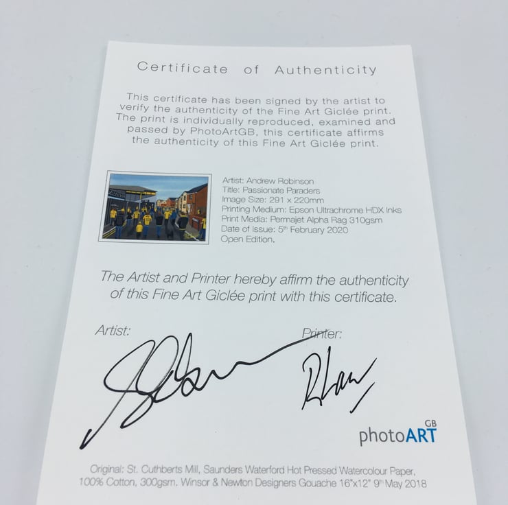 The framed print comes with a 'Certificate of Authenticity' which documents the details of the original painting and the art print. The Certificate of Authenticity is affirmed with a signature from both myself (the artist) and the printer.