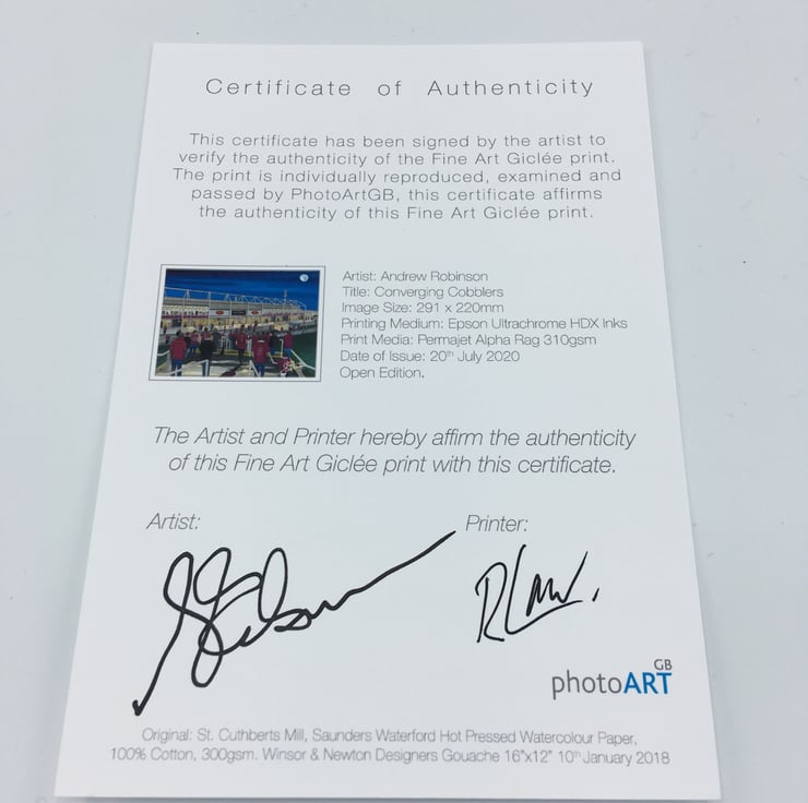 The framed print comes with a 'Certificate of Authenticity' which documents the details of the original painting and the art print. The Certificate of Authenticity is affirmed with a signature from both myself (the artist) and the printer.