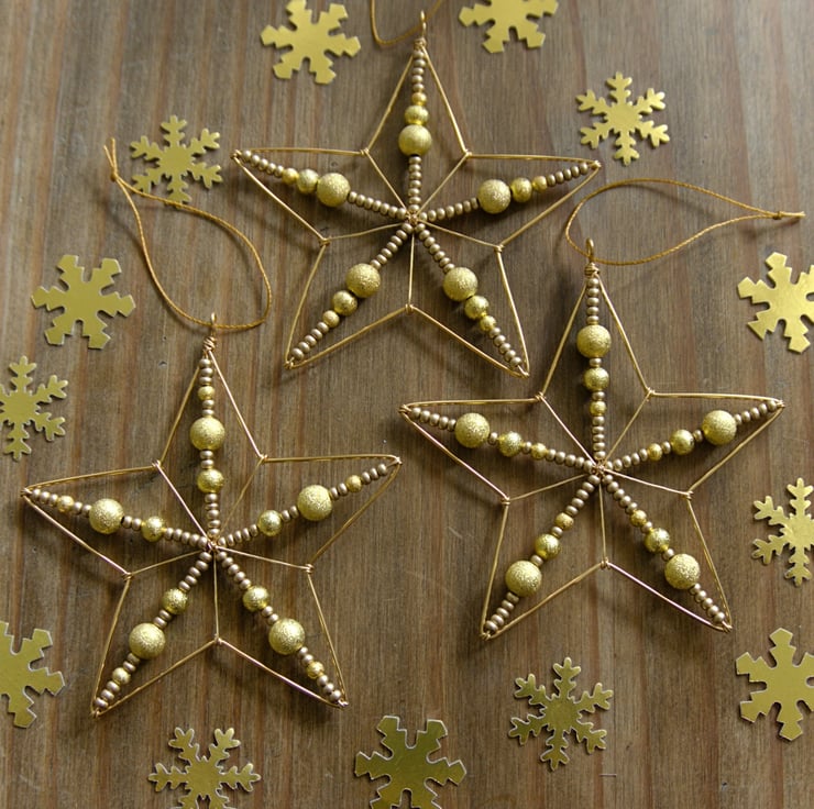 A set of three matching Christmas star hanging decorations in your choice of silver or gold. The five point star frames have been made from hardened wire using my homemade jig. I've then decorated each star with a mixture of metallic sparkle beads in different sizes along with matching metallic seed beads. The sparkly finish on the metal beads really twinkles next to fairy lights - the perfect addition to your Christmas tree!