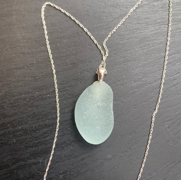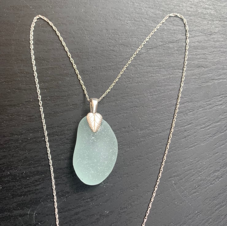 Beautifully smooth pale blue seaglass drop, approx 3X2cm, is mounted on a leaf shape Sterling silver bale that is attached to an 18in Sterling silver rope chain to create a unique piece of jewellery.