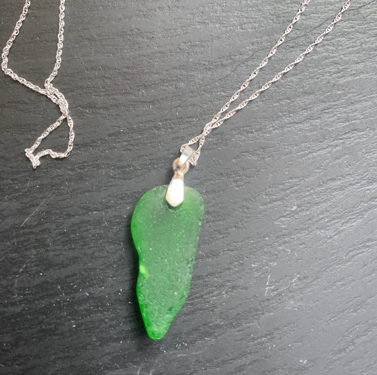 This rich green piece of seaglass measures approx 3x1cm and has a drilled Sterling silver bail to attach to an 18in Sterling silver rope chain.