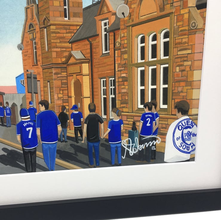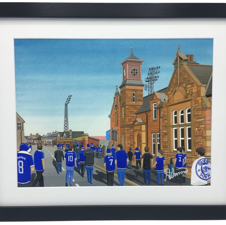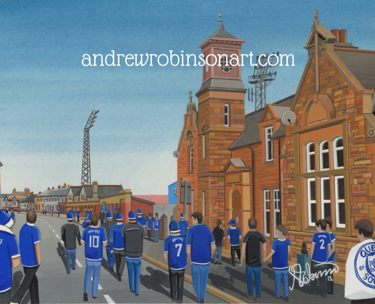Titled ‘Palmeston Park Pilgrimage’ this is a unique Queen of the South F.C print direct from myself the artist. My artworks are a celebration of the match day experience and of stadium architecture.