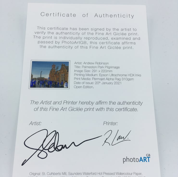 The framed print comes with a 'Certificate of Authenticity' which documents the details of the original painting and the art print. The Certificate of Authenticity is affirmed with a signature from both myself (the artist) and the printer.