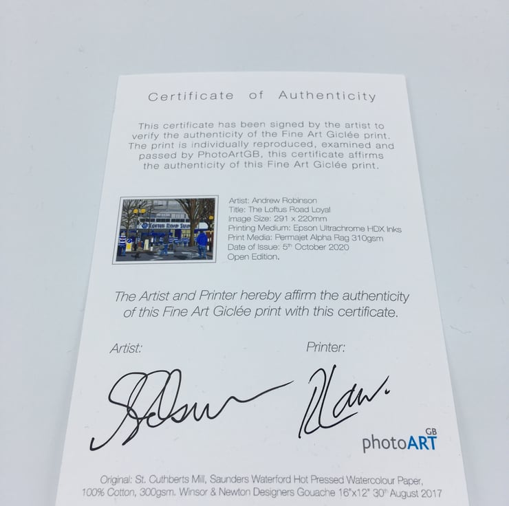 The framed print comes with a 'Certificate of Authenticity' which documents the details of the original painting and the art print. The Certificate of Authenticity is affirmed with a signature from both myself (the artist) and the printer.