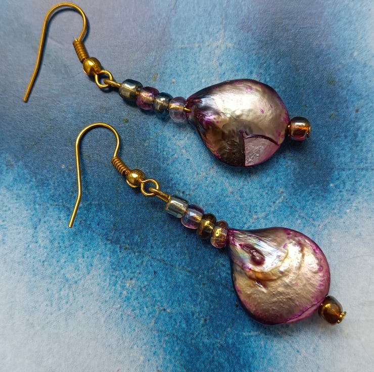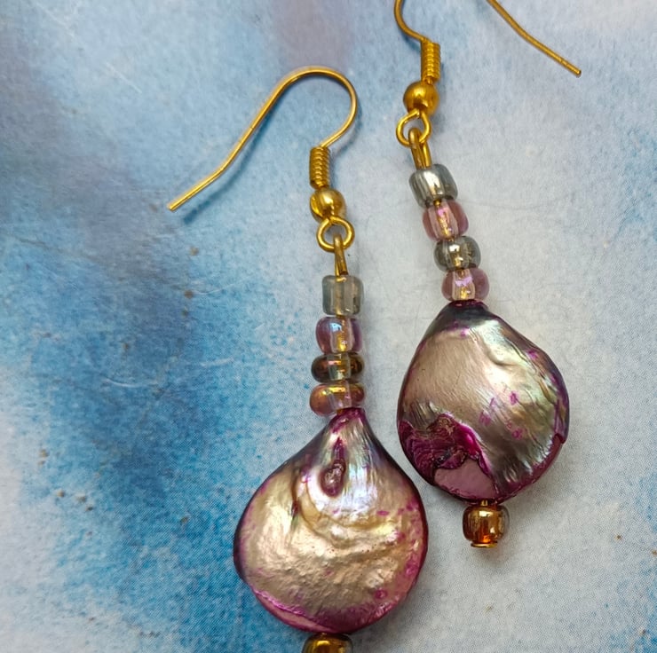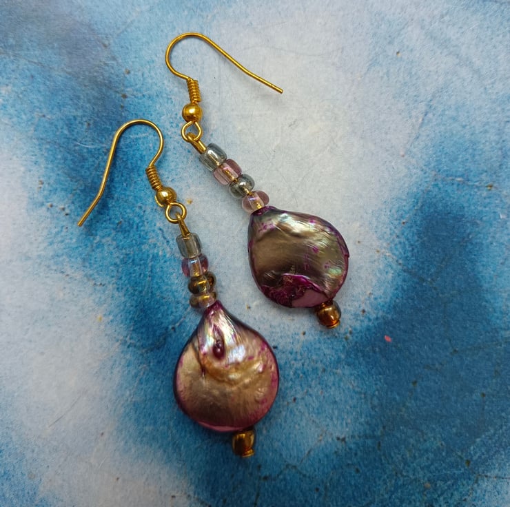 Made with recycled beads, lovely plum coloured shell beads and both clear and purple tiny glass beads. Hanging on sterling silver nickel free hooks. These earrings are so lovely and UK postage is free.
