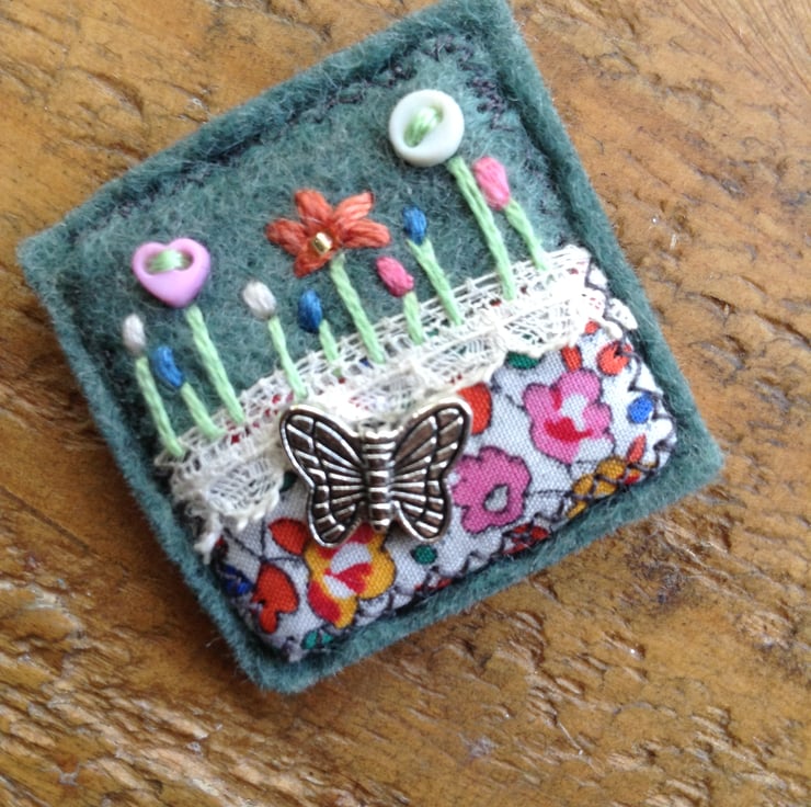 This little brooch is made from felt, a small piece of Liberty fabric, lace, a silver metal butterfly bead and a hand sewn button meadow.