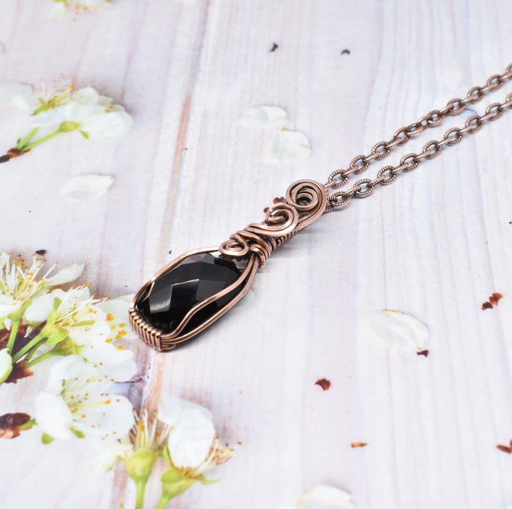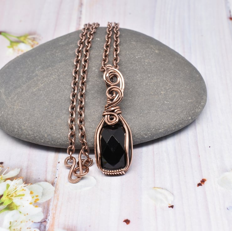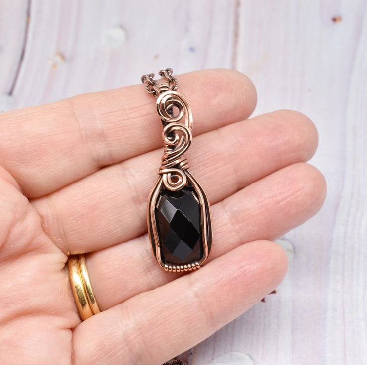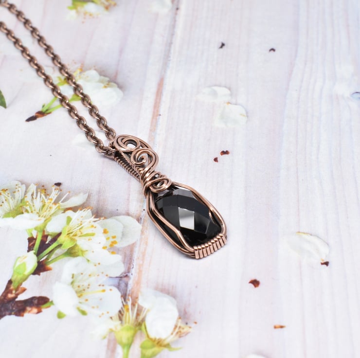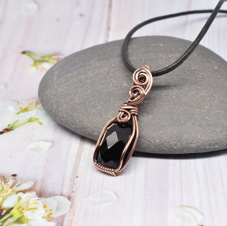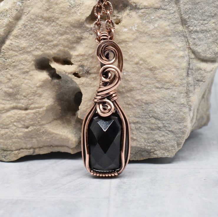 A dainty faceted black onyx I have wire wrapped using solid copper wire to make this unisex pendant.