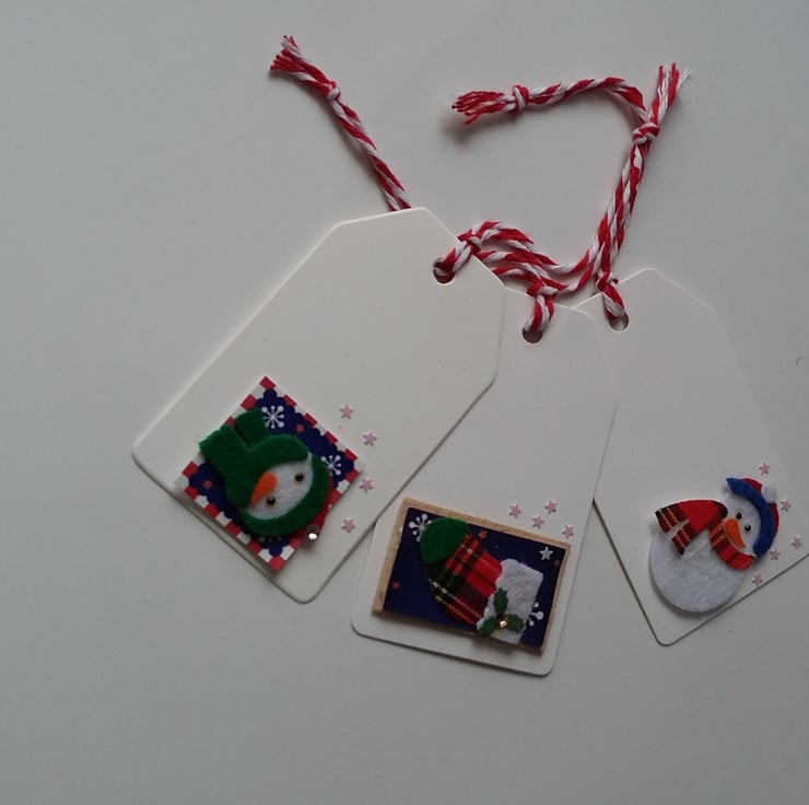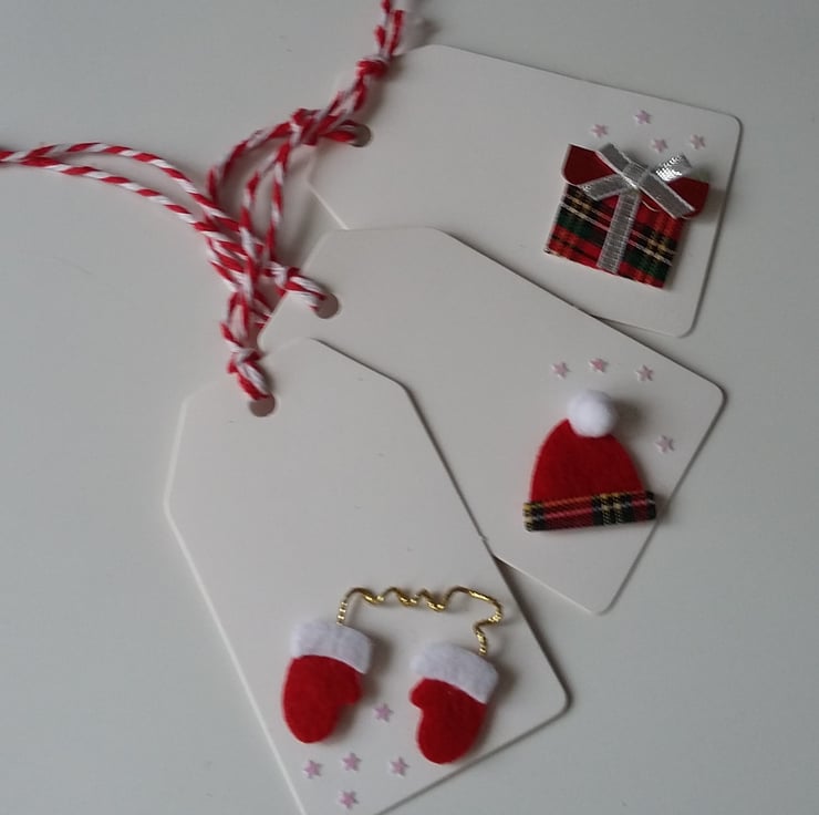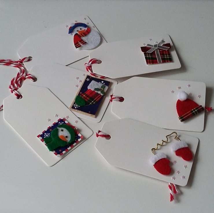A SET OF 6 CHRISTMAS GITF TAGS WAS ASSORTED PICTURES AND FINISHED WITH RED AND WHITE TIES
