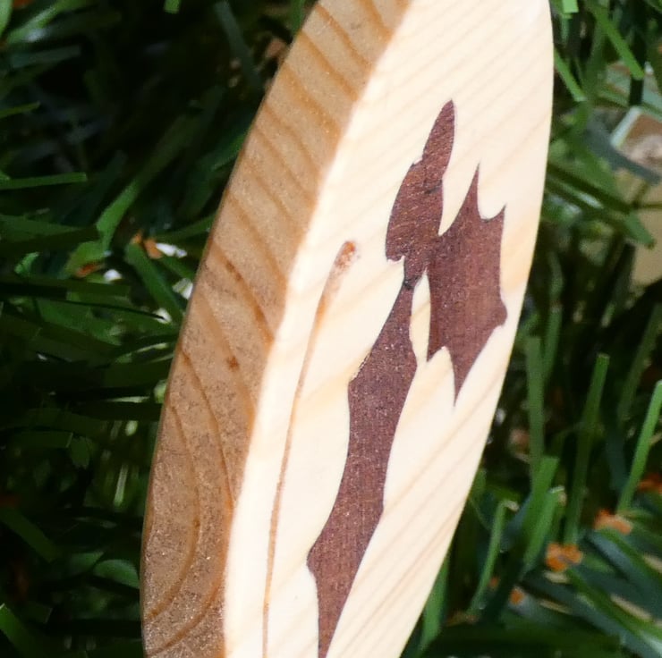 A piece of recycled wood was cleaned and sanded to enable me to upcycle it. The design was applied to the wood and cut using a Scroll Saw. The Intarsia woodworking technique was applied where different species of wood were cut and shaped into three dimensional pieces and then glued together to form a design. The decoration was finished with Danish Oil with is food and toy safe. To complete the decoration a loop and ribbon were added to allow for hanging.