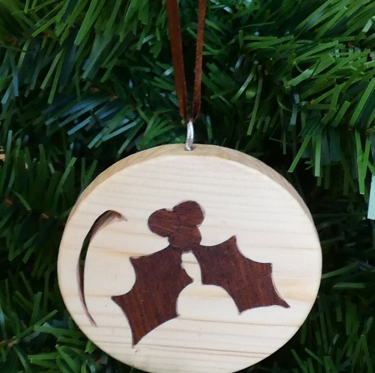 This unique wooden round Christmas Tree ornament with a Holly insert, has been upcycled from reclaimed Pine and Sapele (also known as African Mahogany) wood. This beautiful Christmas bauble will make a lovely addition to your Christmas tree. This ornament will make a perfect gift for numerous occasions such as a best friend gift, a gift for aunt or a Christmas present.