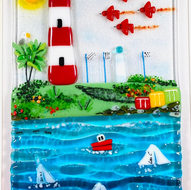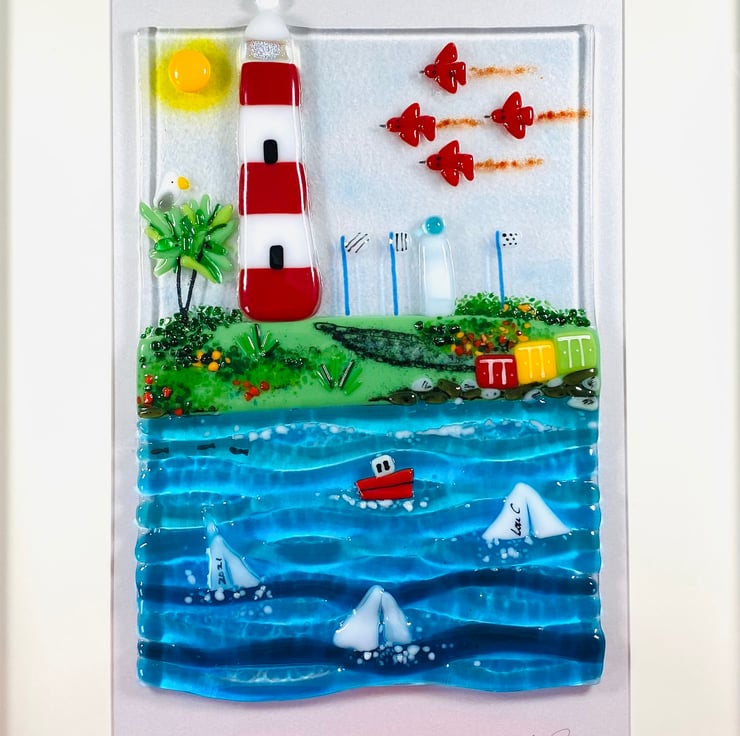 Fused glass art framed picture of smeatons tower and Plymouth seafront with red arrows . All fused glass hand made glass . Contoured and beautifully light reflective 17 inch x 12 inch frame size . Strung for easy wall hanging .