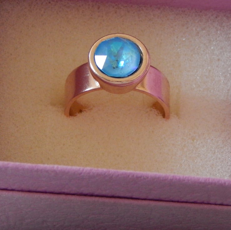 Made with 8mm Ultra Blue Swarovski chaton in an adjustable rose gold ring base.