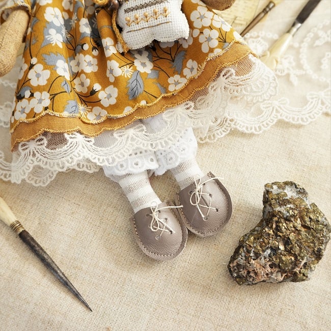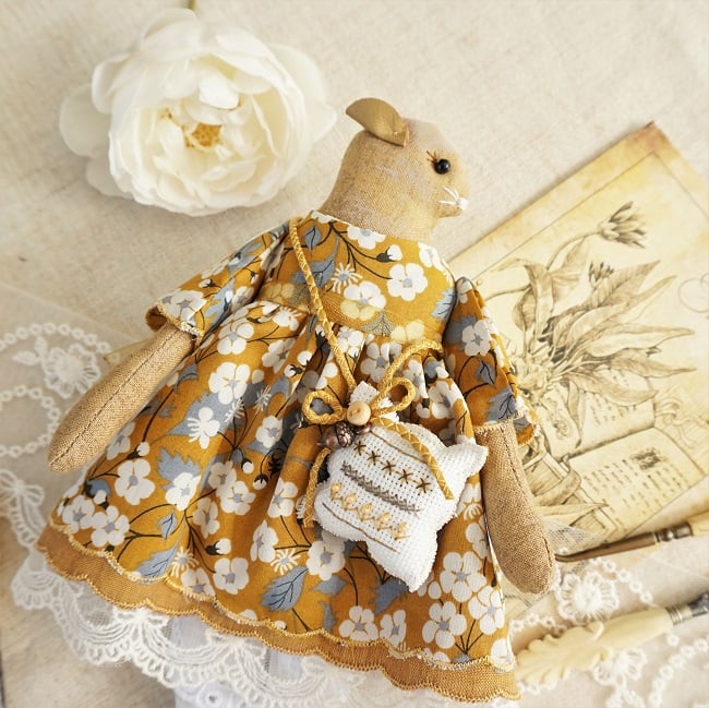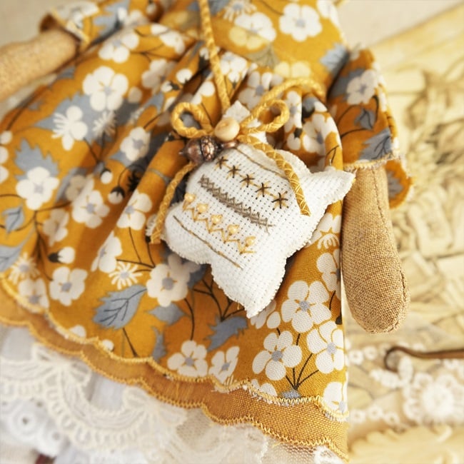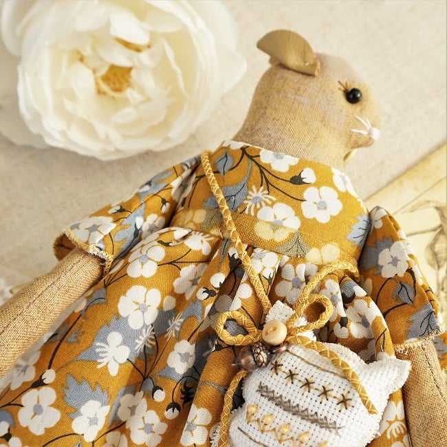 This is Mustard Seed, a tiny harvest mouse. She is a hand embroidered mouse with little leather ears and tail. She is dressed in a Liberty tana lawn cotton called Mitsi Mustard with coordinating underskirts and cotton lace bloomers. Her dress is finished with organza ribbon, tiny buttons and little leather shoes.