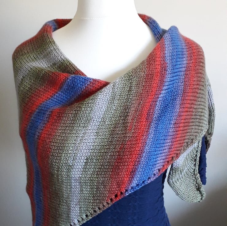 This triangular shawl has been lovingly knitted on a hand operated knitting machine and features pretty eyelets along two sides for a decorative finish.